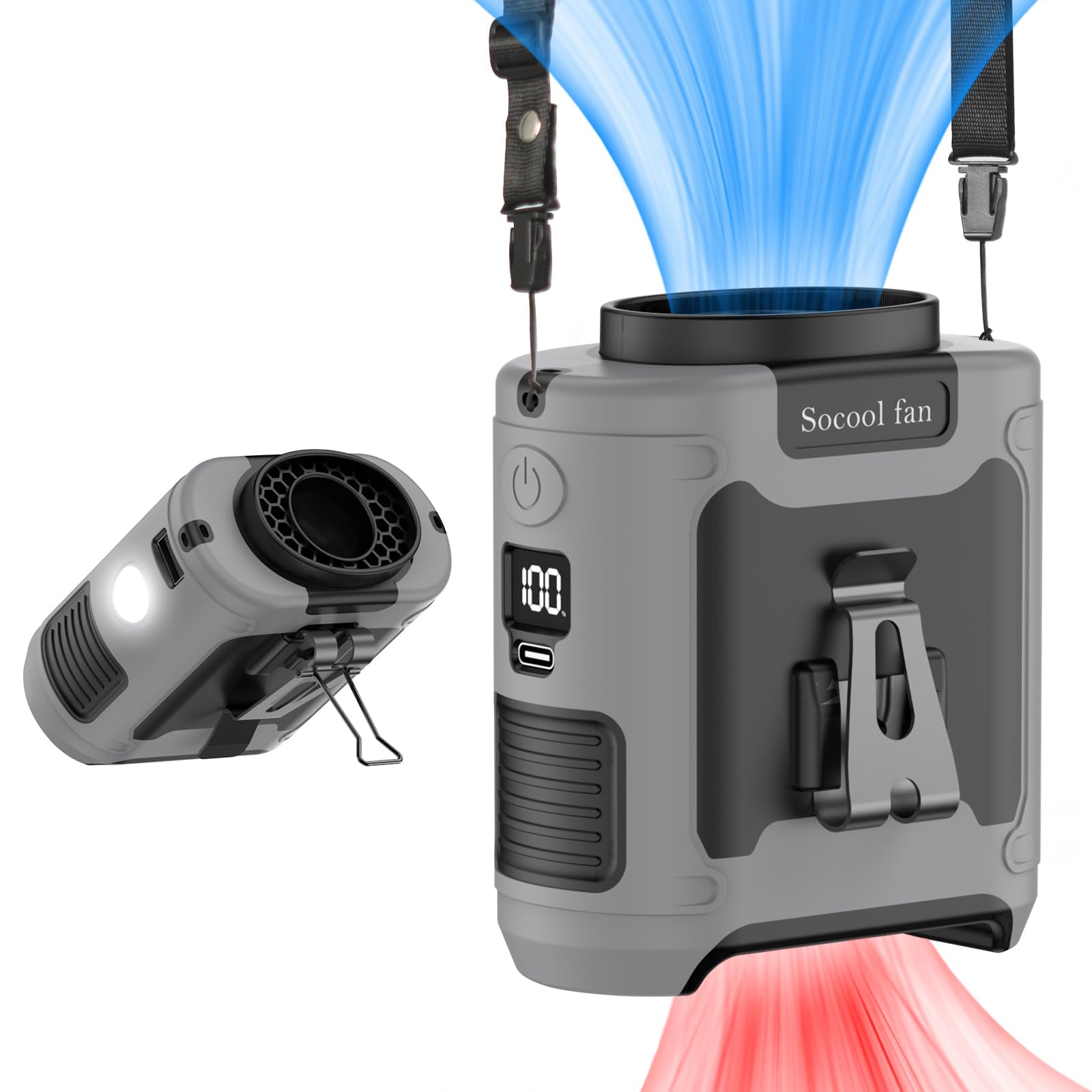 Socool 10000mAh Portable Waist Fan Clip on Wearable Belt Personal Fan Rechargeable Battery Operated With 5 Speeds & Flashlight Neck Hands-Free 40H Cooling For Outdoor Travel Camping Power Bank (Gray)