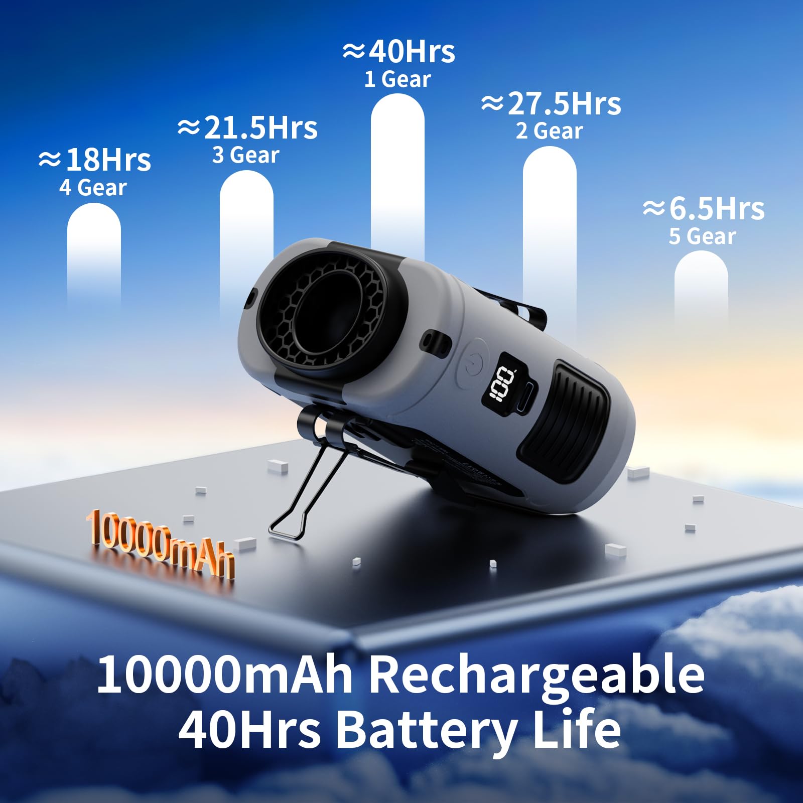 • 【Long Lasting Working Time】Built-in 10000mAh rechargeable battery, which can be run continuously for up to 40 hours at low speed according to the air speed and light mode, and takes 4-5 hours to to fully charge. Our portable waist clip fan can be used when it's during charging. Built-in 5V-3A type C input and 5V-2A USB output, Which is convenient for charging the cordless fan, and it provides long-lasting cooling wherever you need it