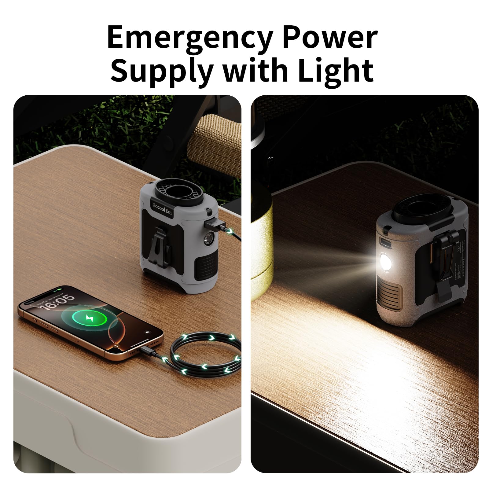 • 【5 in 1 Multifunctional Waist Clip Fan】An integrated waist clip fan, desk table fan, and neck fan. You can clip this belt fan to your shirts, belt, or pants, or you can hang the personal fan around your neck with the lanyard. With a bracket on the fan clip, you can put this USB fan on the desk. It can be used as an emergency power bank to directly charge a mobile phone, with no more fear of running out of phone battery. Built-in LED Light and SOS function, it not only provides long-term illumination but also helps you with outdoor activities