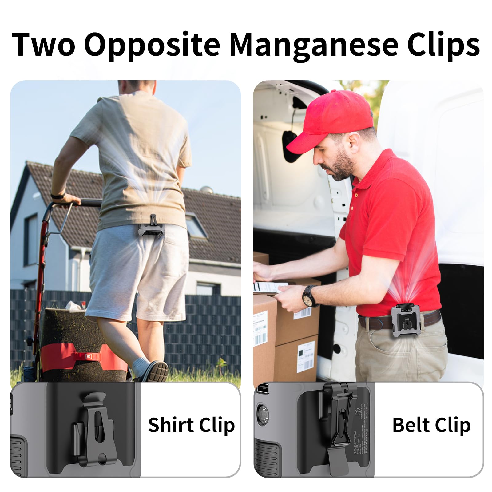 • 【With Silicone Cover, Non-Slip and Anti-Drop】Our mini portable waist fan is designed for various outdoor usage scenarios, catering to occupations like workers and farmers. It comes with a high-quality protective silicone leather case which protects from shock when dropped and ensures the body fan is not damaged at all. The upgraded Manganese steel clamp provides stronger gripping force, always keeping the wearable fan firmly, and is more durable. Practical design with two clips facing opposite directions allows for more placement options
