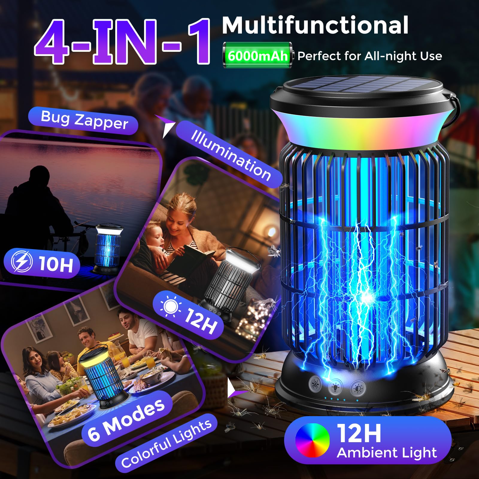 Solar Bug Zapper Outdoor, 4200V Effective Mosquito Zapper, 4-in-1 Cordless Rechargeable Fly Zapper with 6000mAh Battery, Waterproof & Portable Insect Zapper for Patio, Camping, Home Black