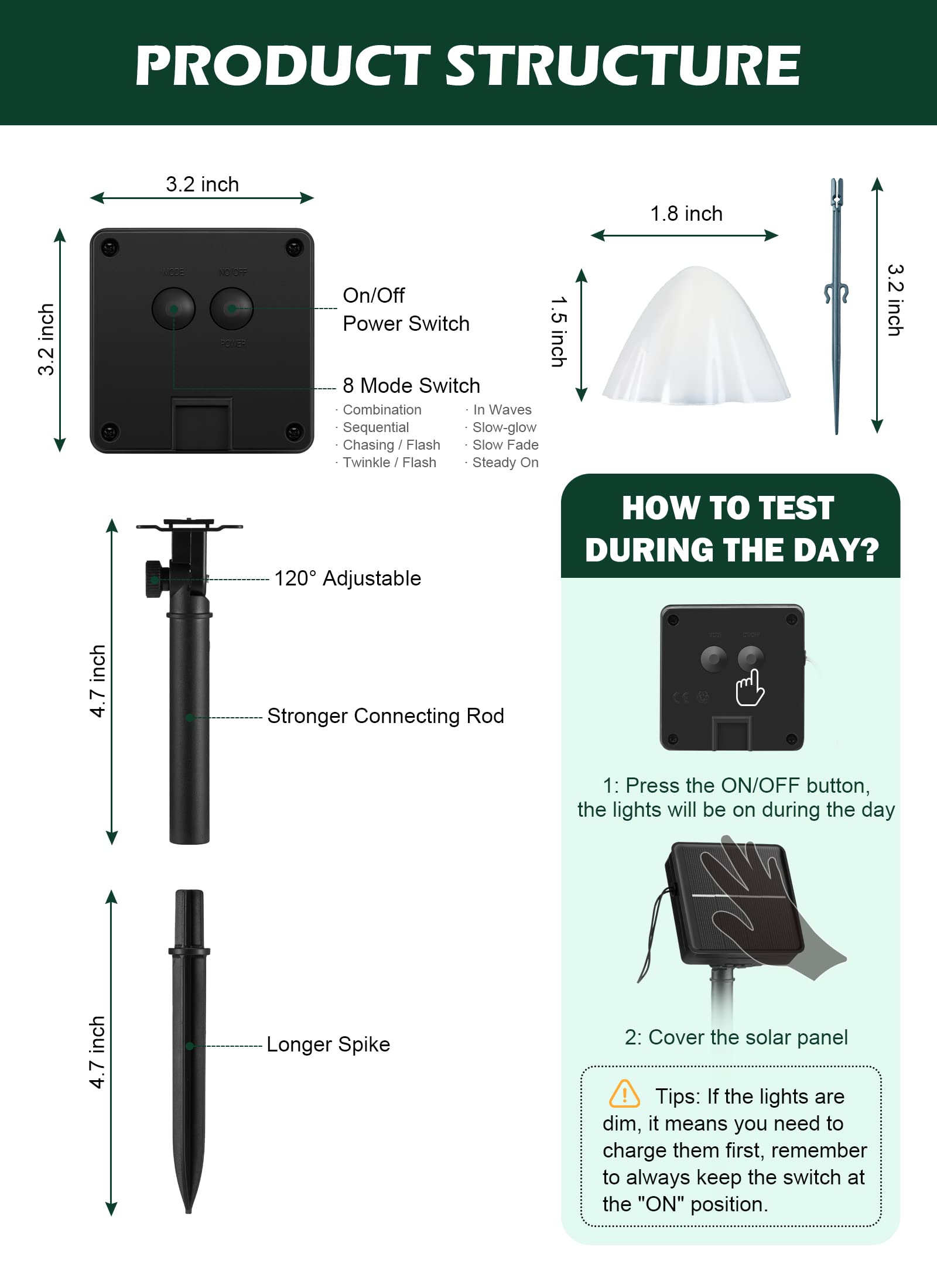 • 【Auto On/Off】There is a built in photosensitive component in the solar panel, the mushroom lights will turn on at dusk and turn off at dawn automatically; No need for manual operation, so convenient for lighting decor.