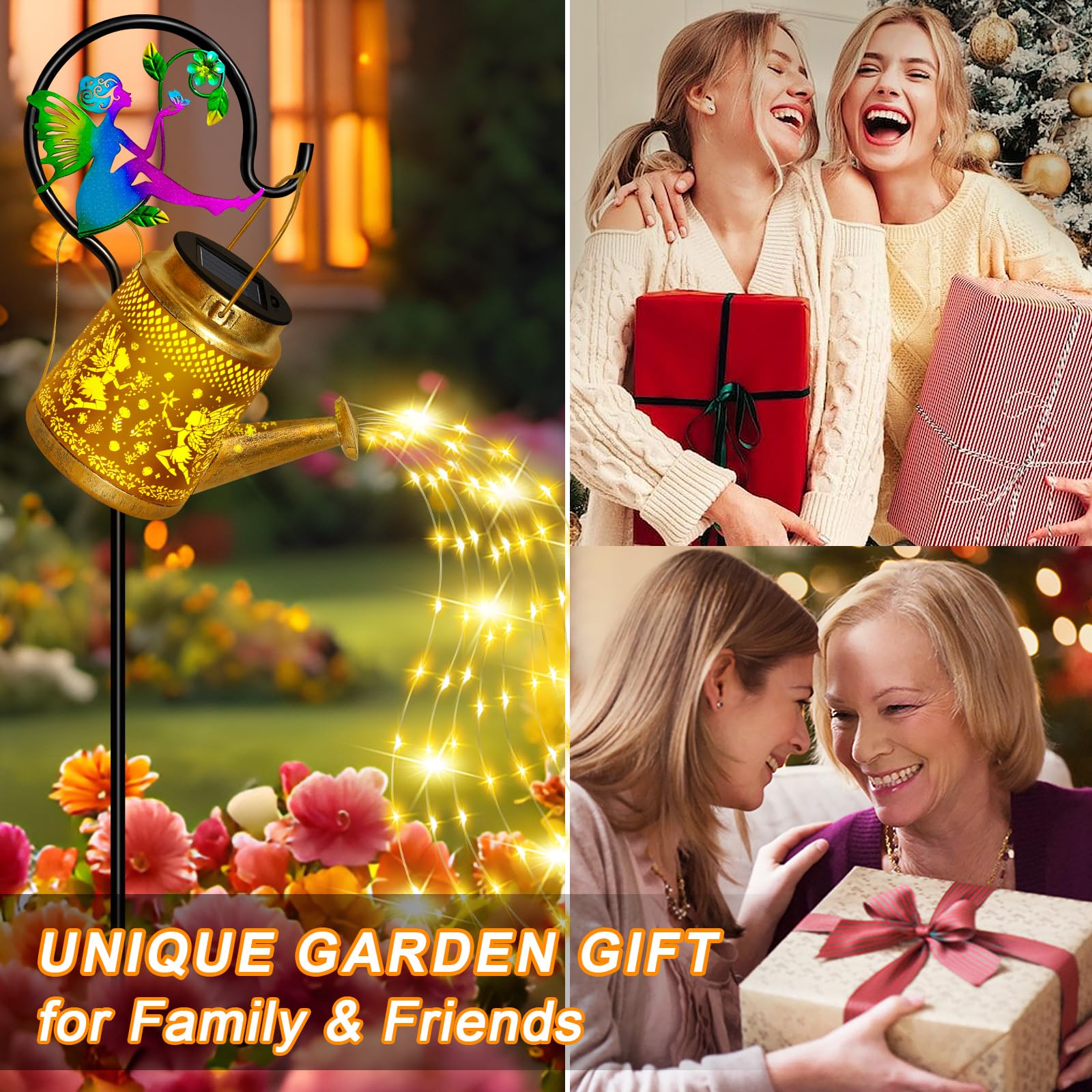 • 【Fairy Watering Can & Shepherd Hook】This Fairy-inspired watering can light is equipped with 80 bright LED lights, distributed across ten 31.1-inch strands to create a mesmerizing cascading glow, hollow-out design casts Fairy patterns onto your garden,. Paired with a sturdy shepherd hook, it is easy to install while ensuring stability in the ground
