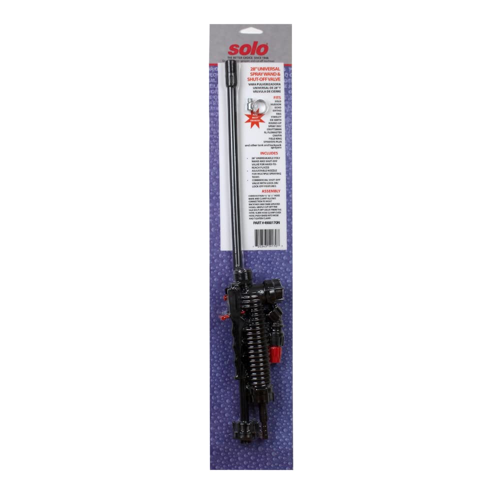 Details: Solo 28-inch universal wand and shut-off valve assembly. A step up in quality and function with an unbreakable 20-inch wand fitted to our commercial grade shutoff valve, stainless filter screen, plastic adjustable and flat fan nozzle. Adapts to virtually all competitors sprayers. Solo's number 1 packaged accessory. Includes stainless hose clamp.