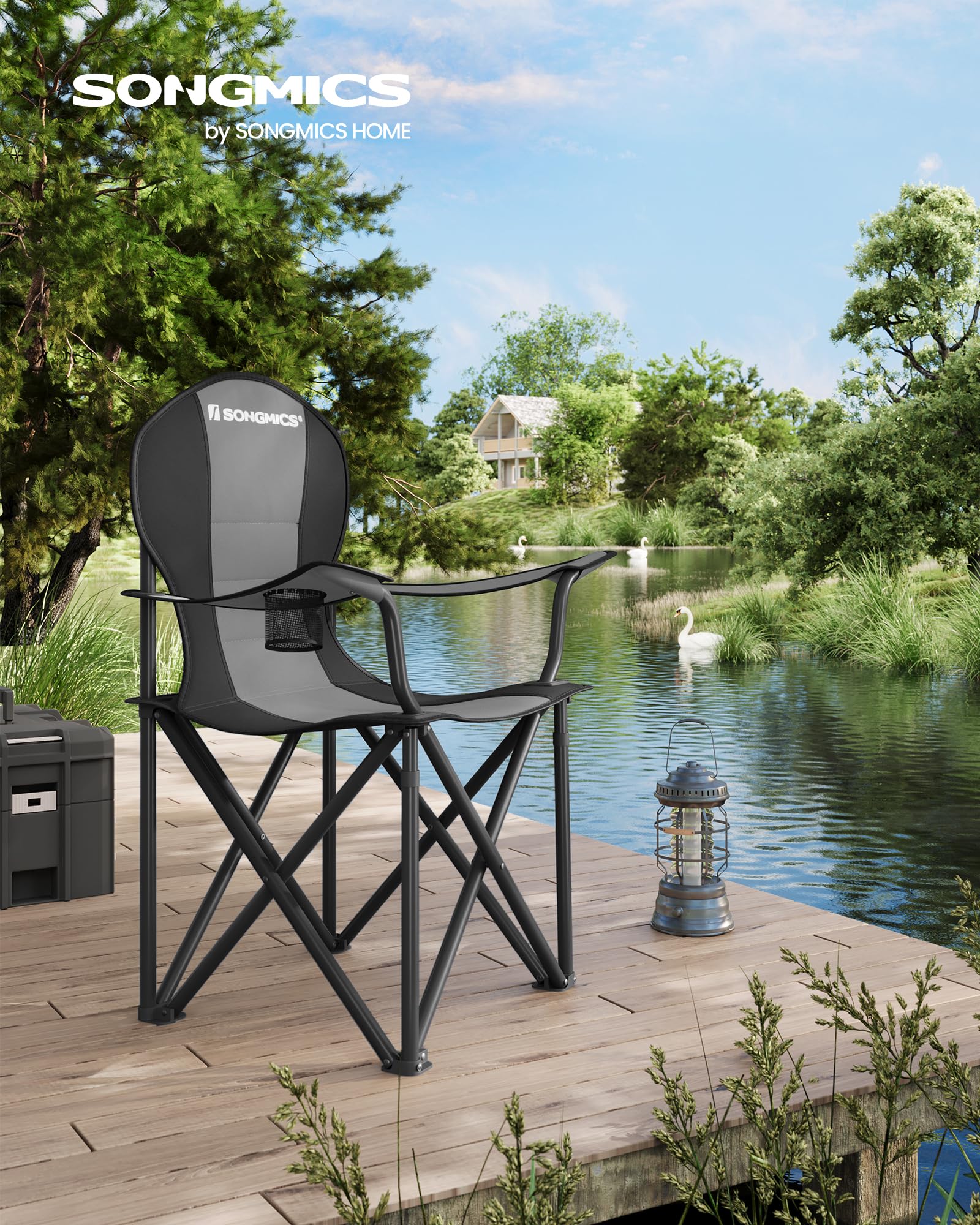 SONGMICS Folding Camping Chair, with Comfortable Sponge Seat, Cup Holder, Heavy Duty Structure, Max Load Capacity 551 lb, Outdoor Picnic Chair, Gray and Black UGCB006G01