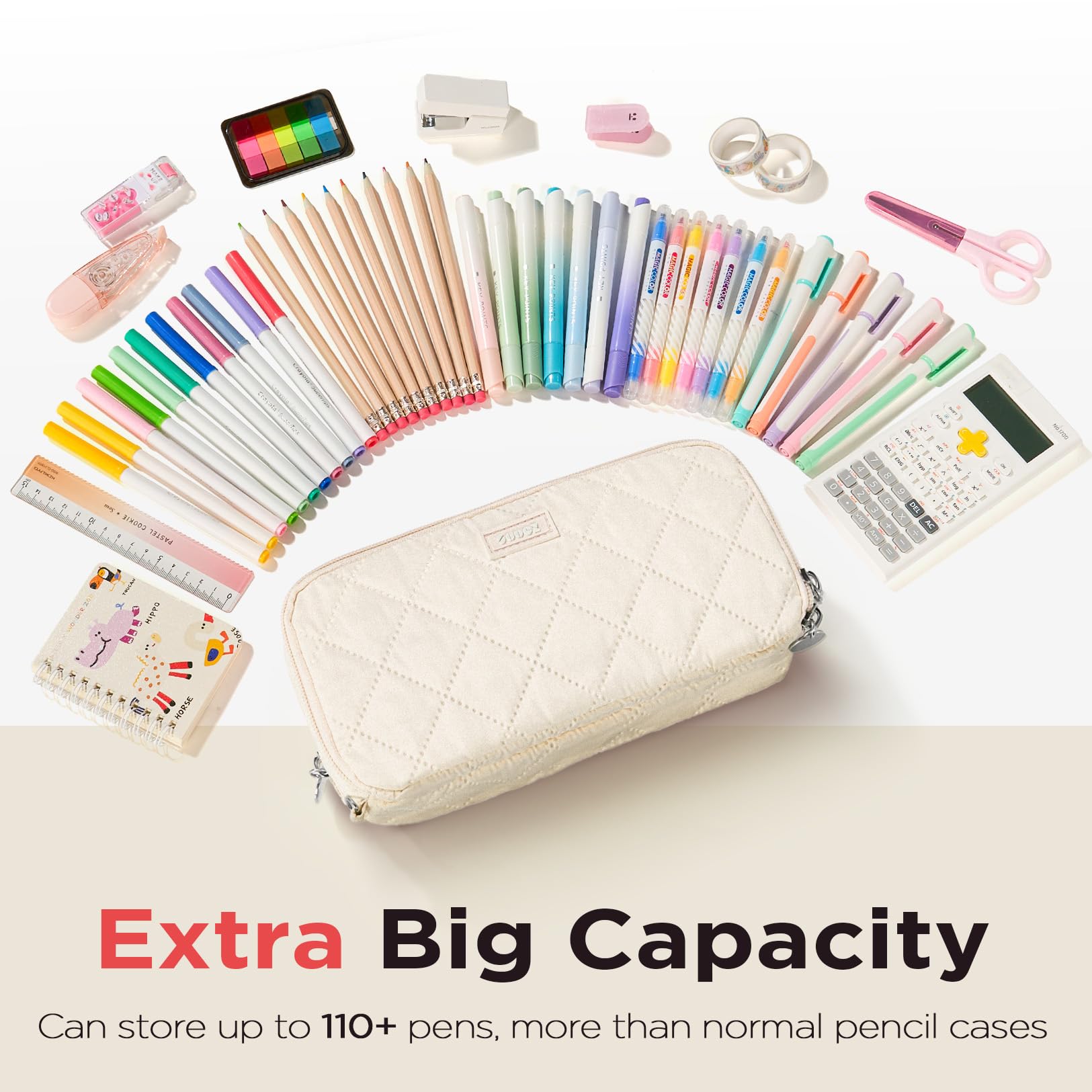 Sooez Large Pencil Case Pouch,Extra Big Pencil Bag with 8 Compartments,Pen Bag Wide Opening,Soft Quilted Pencil Pouch Organizer with Zipper,Portable Pencil Case for Teen Girls,Beige