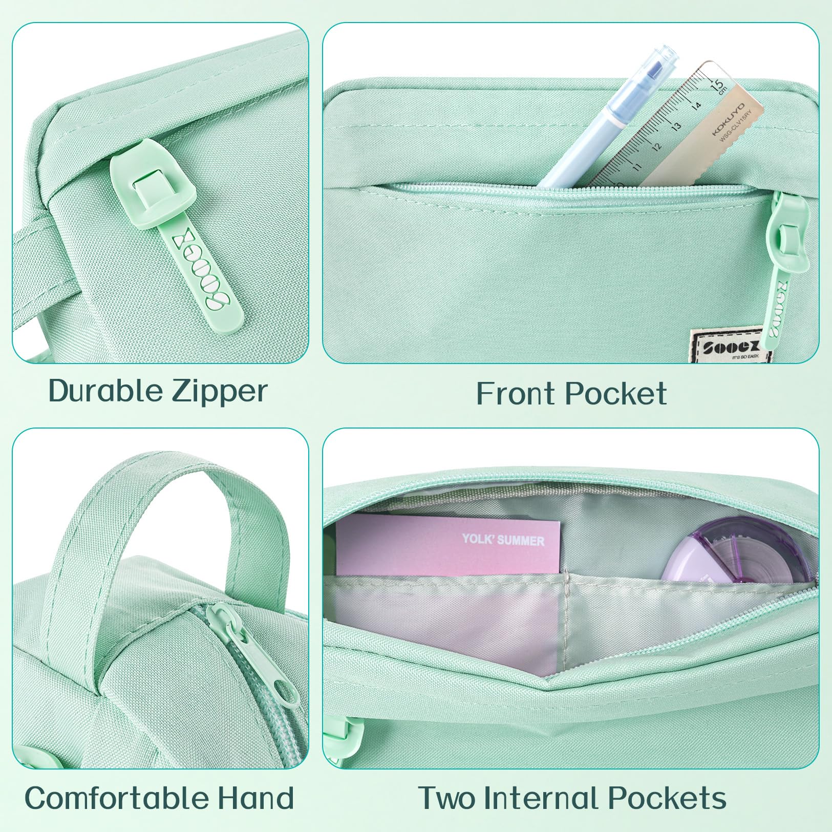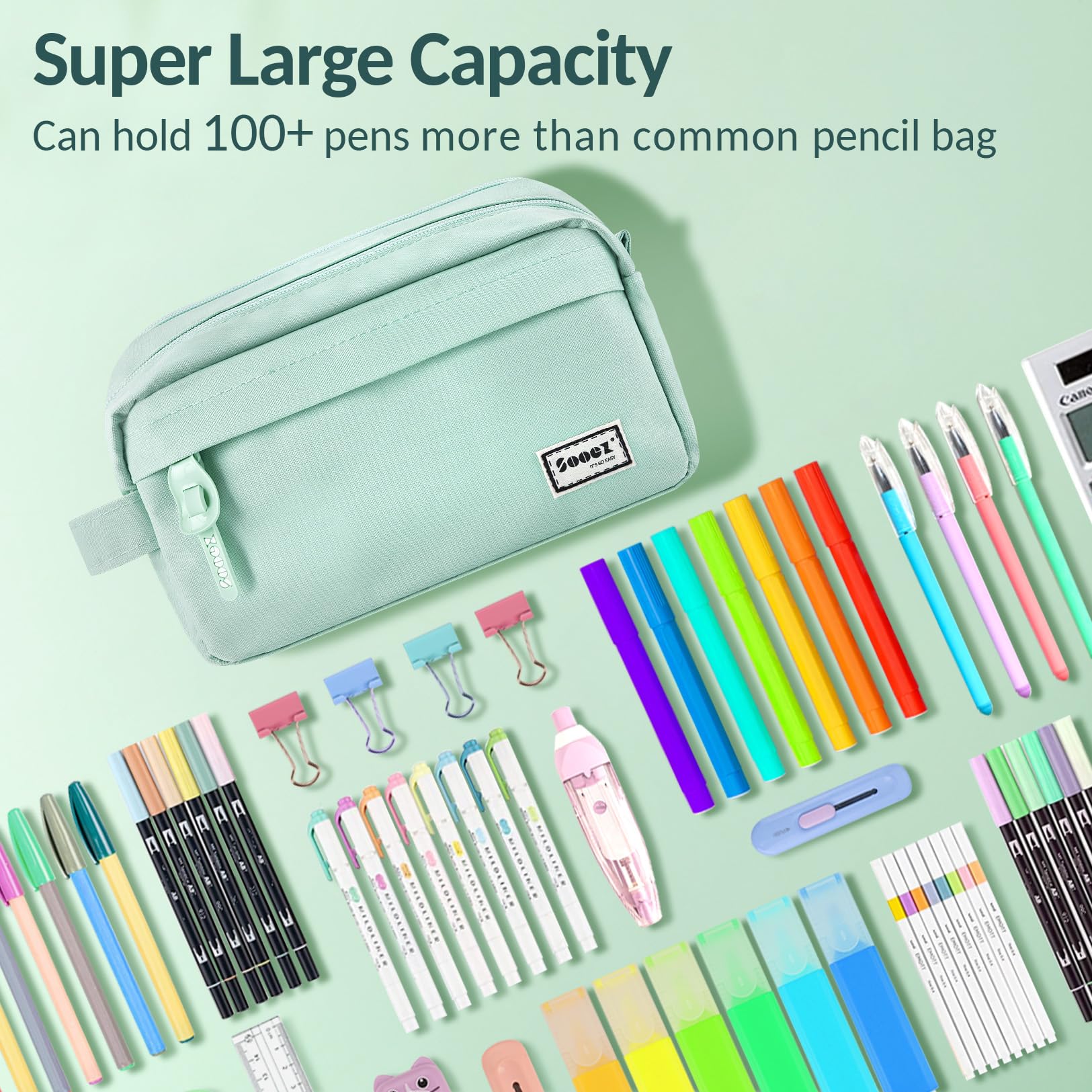 Sooez Original High Capacity Pencil Case, Big Pencil Bag Pouch Box Organizer Pen Case, Portable Journaling Supplies with Easy Grip Handle & Loop, Aesthetic Supply for Girls Adults, Mint Green