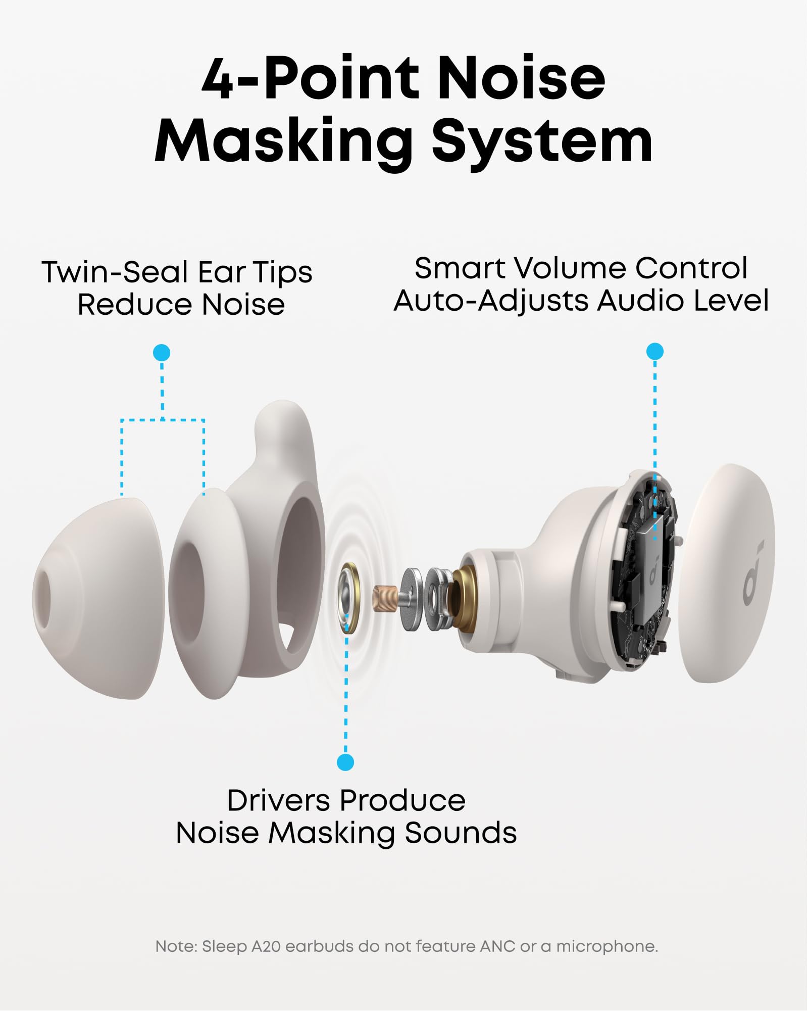 • A Full Night's Peaceful Sleep: Our exclusive 4-point noise masking system and twin-seal ear tips with 3× stronger passive noise blocking mask snoring, pet sounds, and ambient noise. Note: Sleep A20 does not feature active noise cancelling.