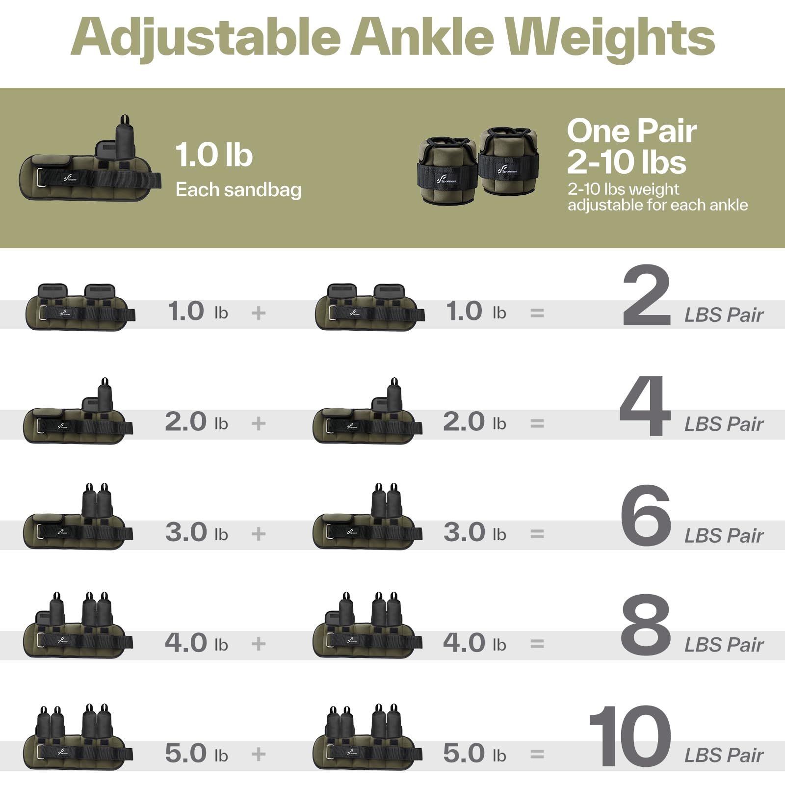 Sportneer Adjustable Ankle Weights for Women and Men:1 Pair 1 2 3 4 6 7 8 10 lbs Upgraded Easily Adjustable Leg Weight, Weighted Wrist Weight Strap for Gym, Fitness, Workout, Walking, Dancing (Army Green, 5 lbs x 2)