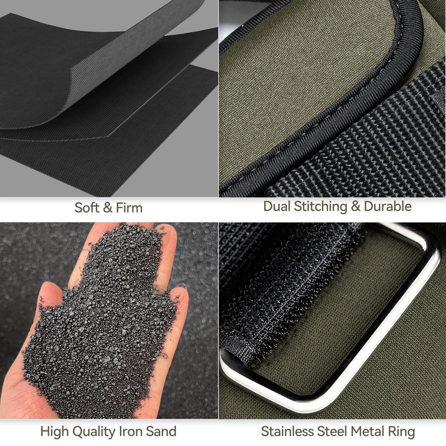 • Premium Materials: The leg weights are made with high-quality fabric for a comfortable and sweat-absorbent workout. The small sandbags inside are double-layered, preventing sand leakage and rust. The stainless steel D-ring is rust-resistant, even with sweat or water exposure. These weights have enhanced stitching and a secure magic-hook closure for durability.