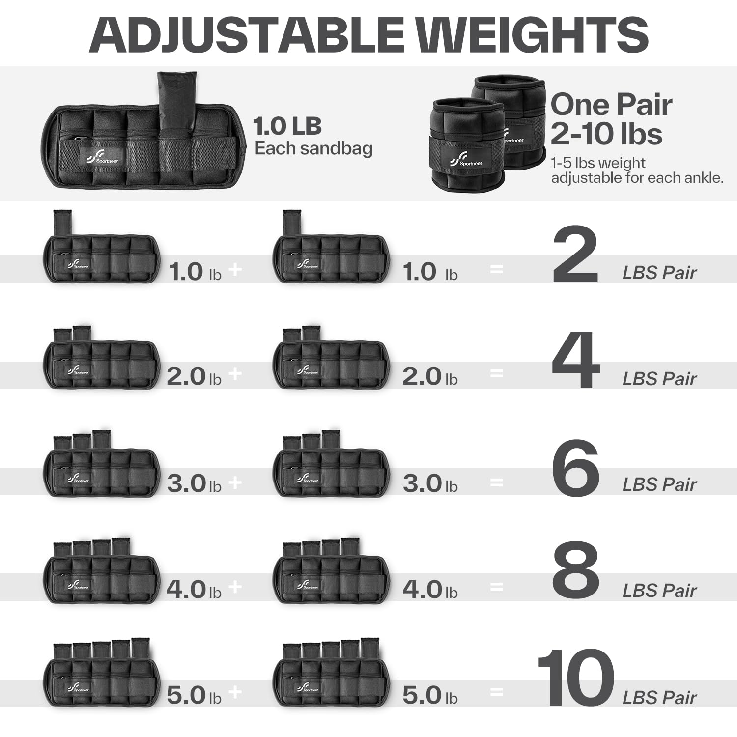 Sportneer Adjustable Weighted Ankle Weights Set 1 Pair 2 4 6 8 10 Lbs Leg Weight Straps for Women Men for Gym,Fitness, Workout,Walking, Jogging,1-5 lbs for Each Ankle, 1 Pair 2-10 lbs (Black)