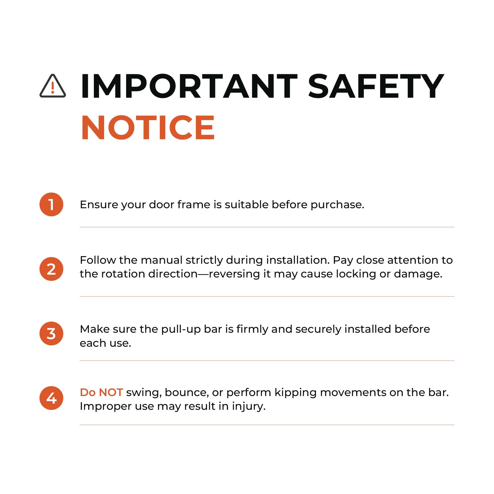 • Easy Installation: Install quickly with detailed instructions, a video guide, and arrow markers on the chin-up bar. Spirit levels on both ends ensure correct setup. Ensure your doorway or wall is solid; avoid ceramic tiles, glass or non-solid doorframe. Note: Verify the marked rotation direction; reversing it may cause locking