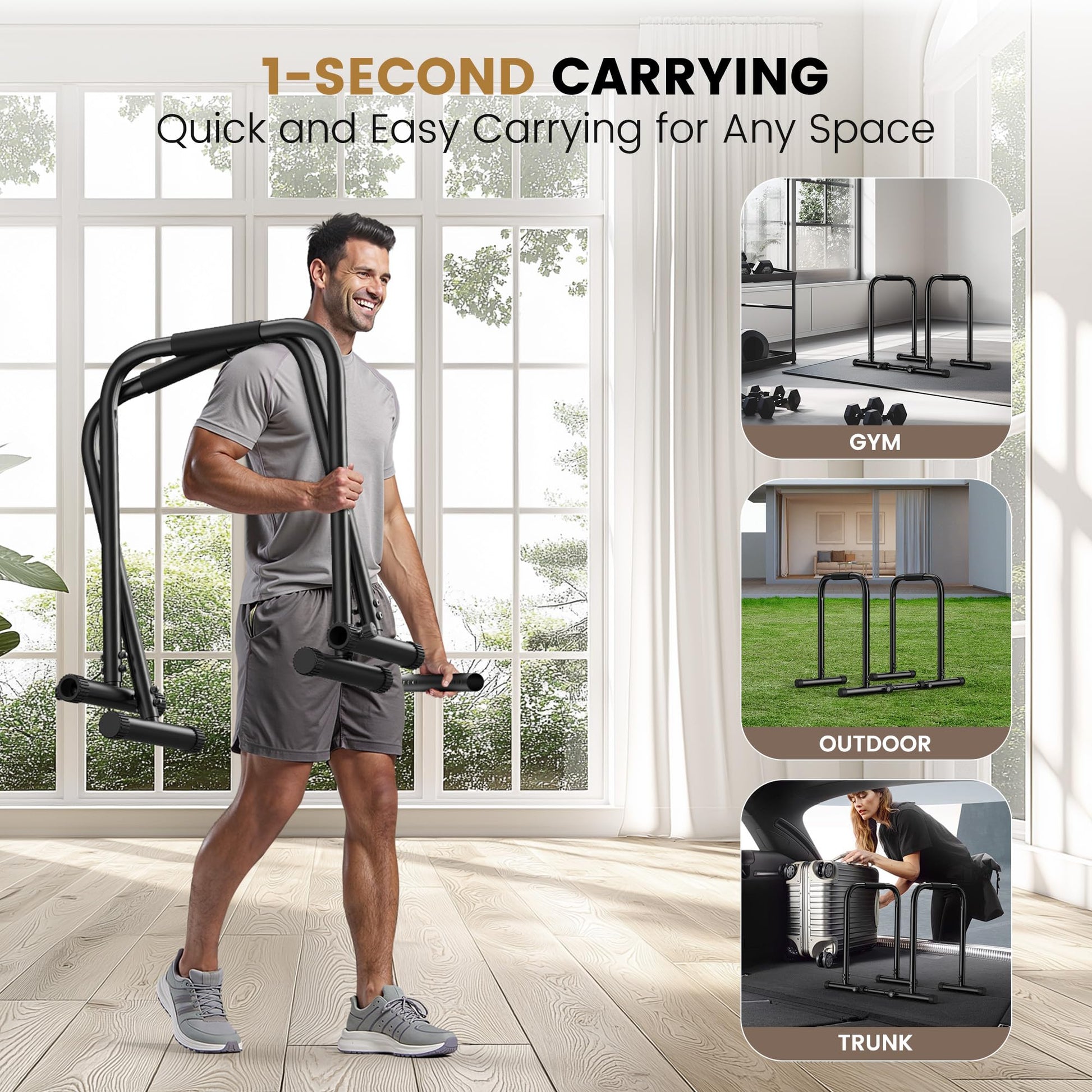 • 【1-SECOND CARRYING】This parallel bar is compact and lightweight, perfect for both indoor and outdoor use. It is easy to carry, you can switch from home to outdoors in seconds, it is your ideal fitness companion wherever you go.