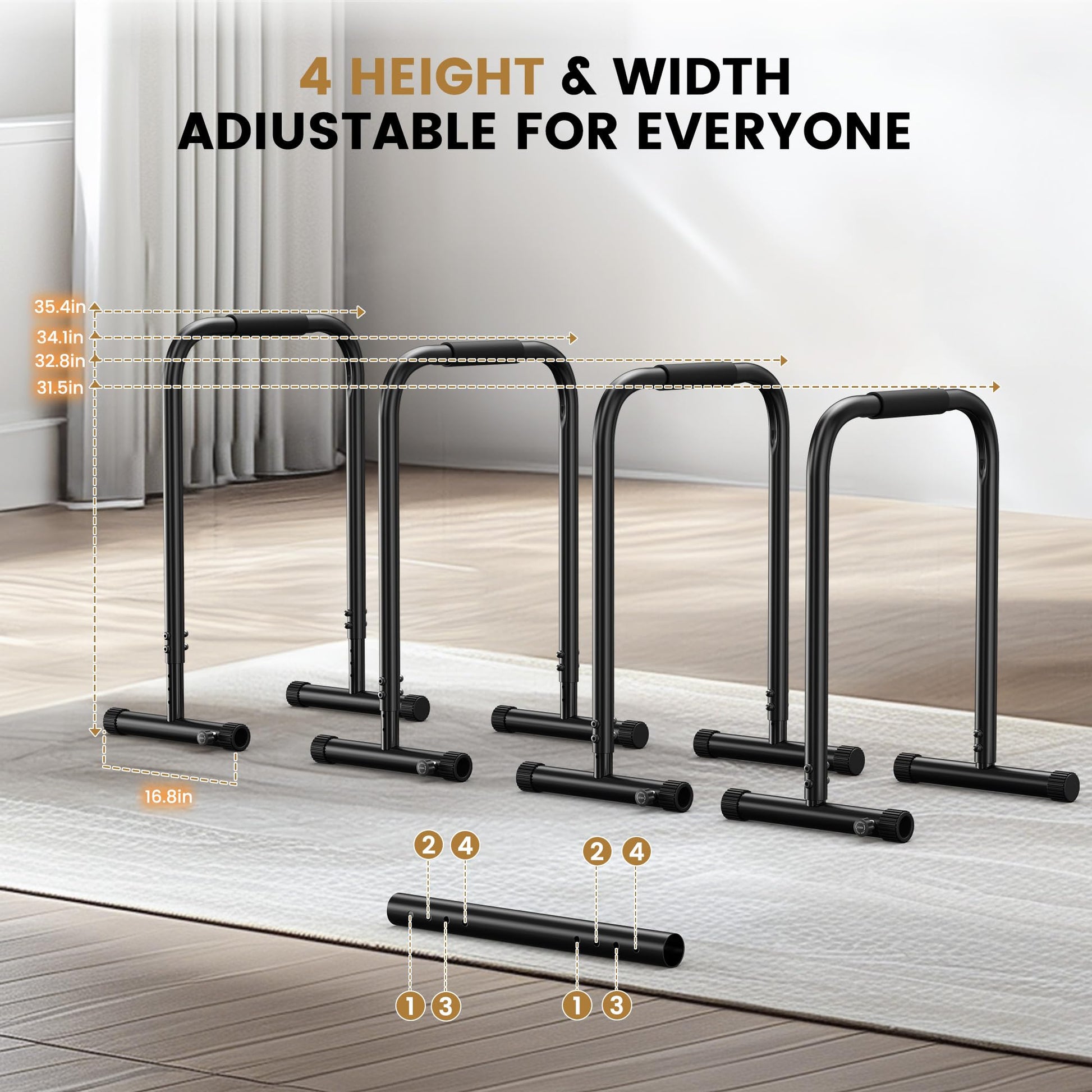 • 【4 HEIGHT & WIDTH ADIUSTABLE FOR EVERYONE】This parallel bar has four height and four width adjustments, so it's easy to customize the station to your needs. Whether you prefer strength training or cardio, this personalization ensures you get an efficient and effective workout.