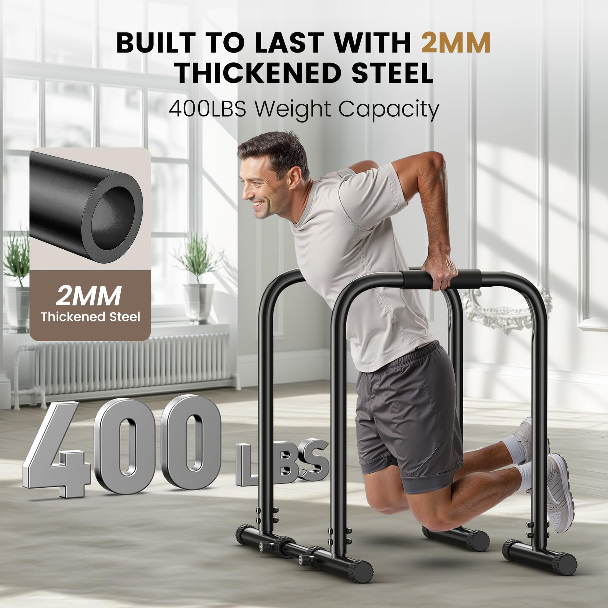 • 【BUILT TO LAST WITH 2MM THICKENED STEEL】Made from heavy-duty steel, the dip station offer impressive durability and can support up to 400 lbs. It is designed for users of all body types and strength levels, ensuring long-term use without worrying about wear and tear or malfunction.