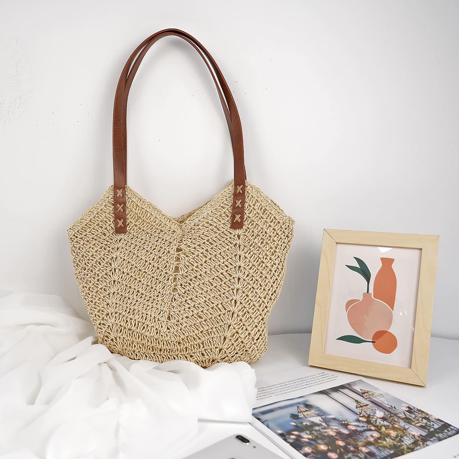 This straw shoulder bag measures about 14.5x11.8inch, it is large enough for you to package some daily necessities, such as phones, wallet, cosmetics, etc. And it has a pocket in the lining for keys or small objects.
