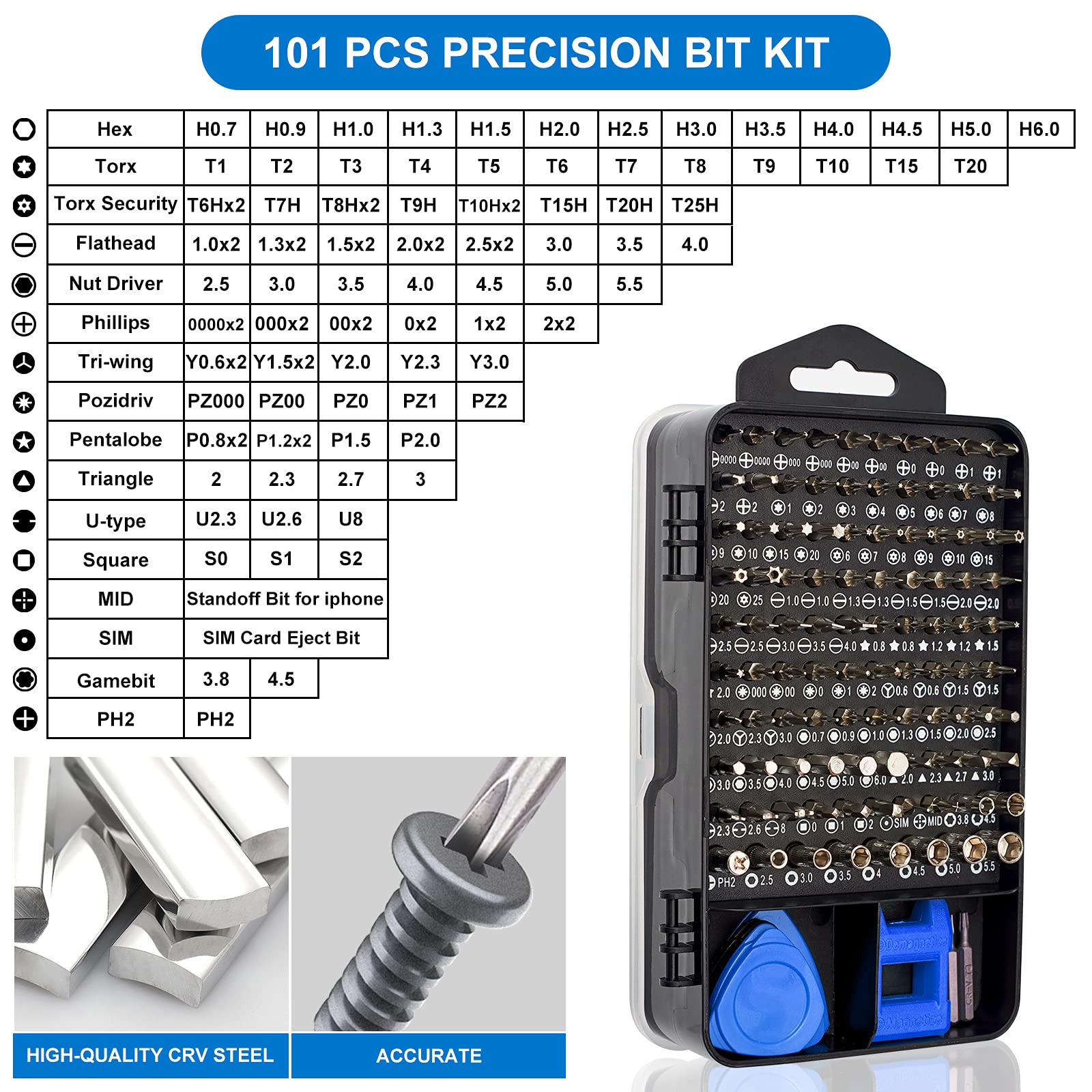 • 【Superior in Quality】These 4mm precision bits are made of premium Chrome Vanadium Steel which hardness can reach 60HRC, so the tips are sturdy, durable and not easily stripped, ensure long product lifespan. The bits are precisely CNC machined to be accurate. And every bit is engraved part number and size for fast recognition. In addition, this screwdriver bit set gives you duplicates for the most commonly used bits in case one gets lost