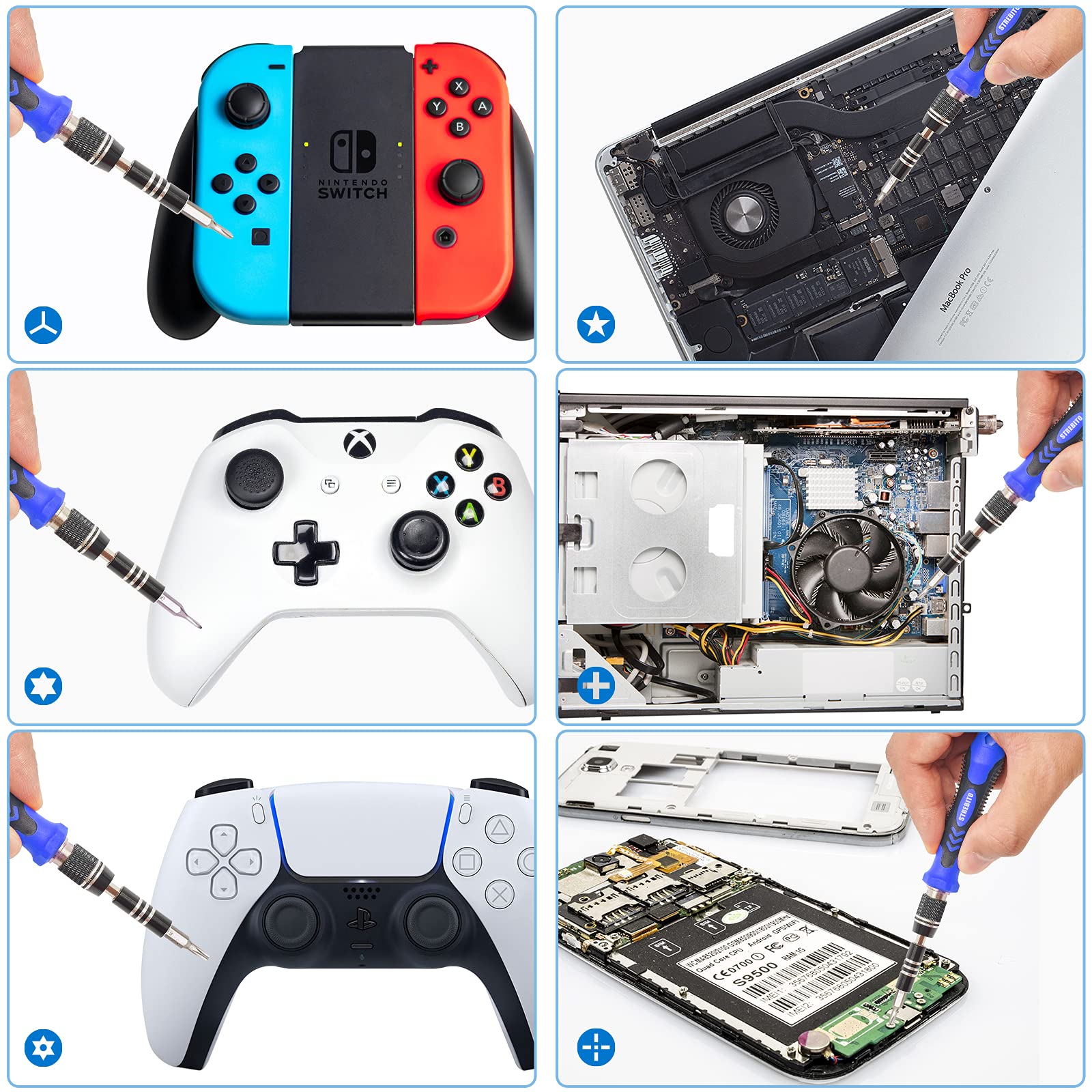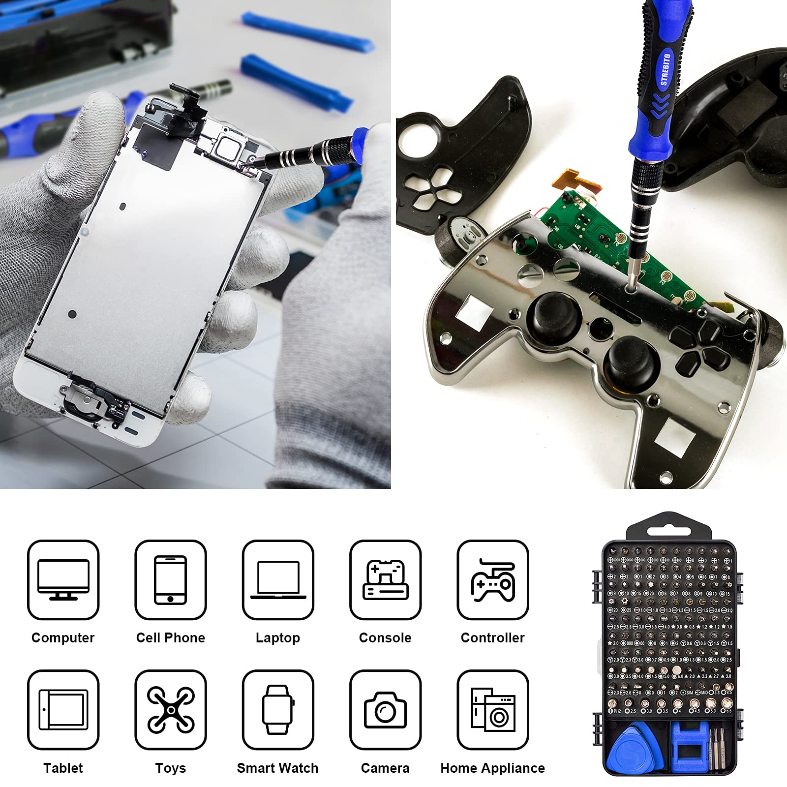 • 【Variety & Versatility】STREBITO 124 electronic screwdriver set includes 101 precision bits, complete with every driver head you'll need to repair any electronics, such as Apple & Android mobile phone, PC, laptop, iPhone, Mac, PlayStation 5/4/3, Xbox series game console & controller, tablet, iPad, RC toys, watch, eyeglass, etc. This is the do-everything toolkit every DIYer, fixer, IT geek, professional tech and hobbyist needs, also a decent gift for your family, friends, colleagues, etc