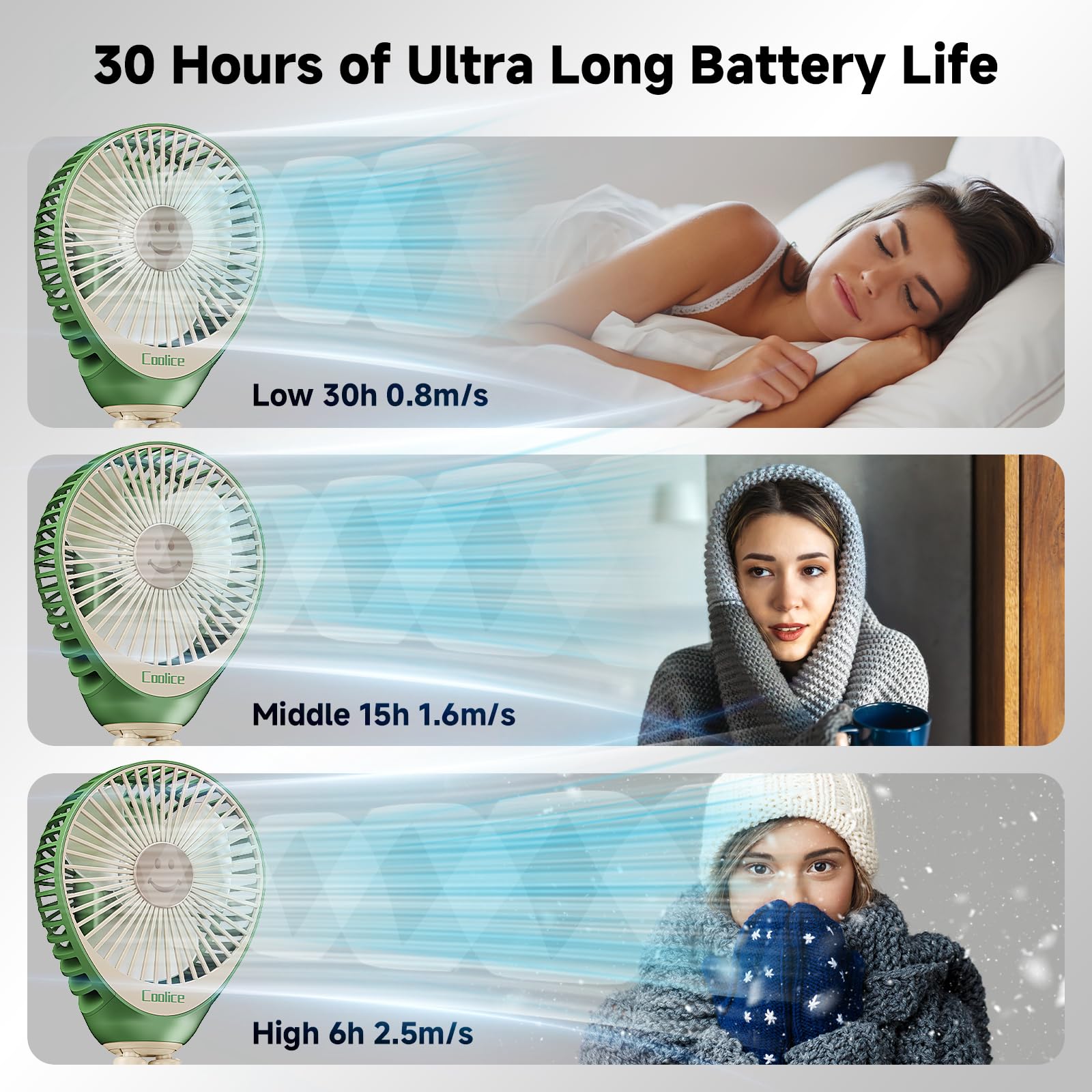 • 【Stroller Fans with 30-hour Battery Life】 The battery capacity of this clip on fan battery operated is 6000 mAh, large battery capacity is a strong guarantee of long battery life. With a 6-hour full charge, this portable fan for car provides 6-30 hours of long battery life, depending on the air velocity. Out of the door can be used all day, suitable for camping, hiking, picnic, the beach!
