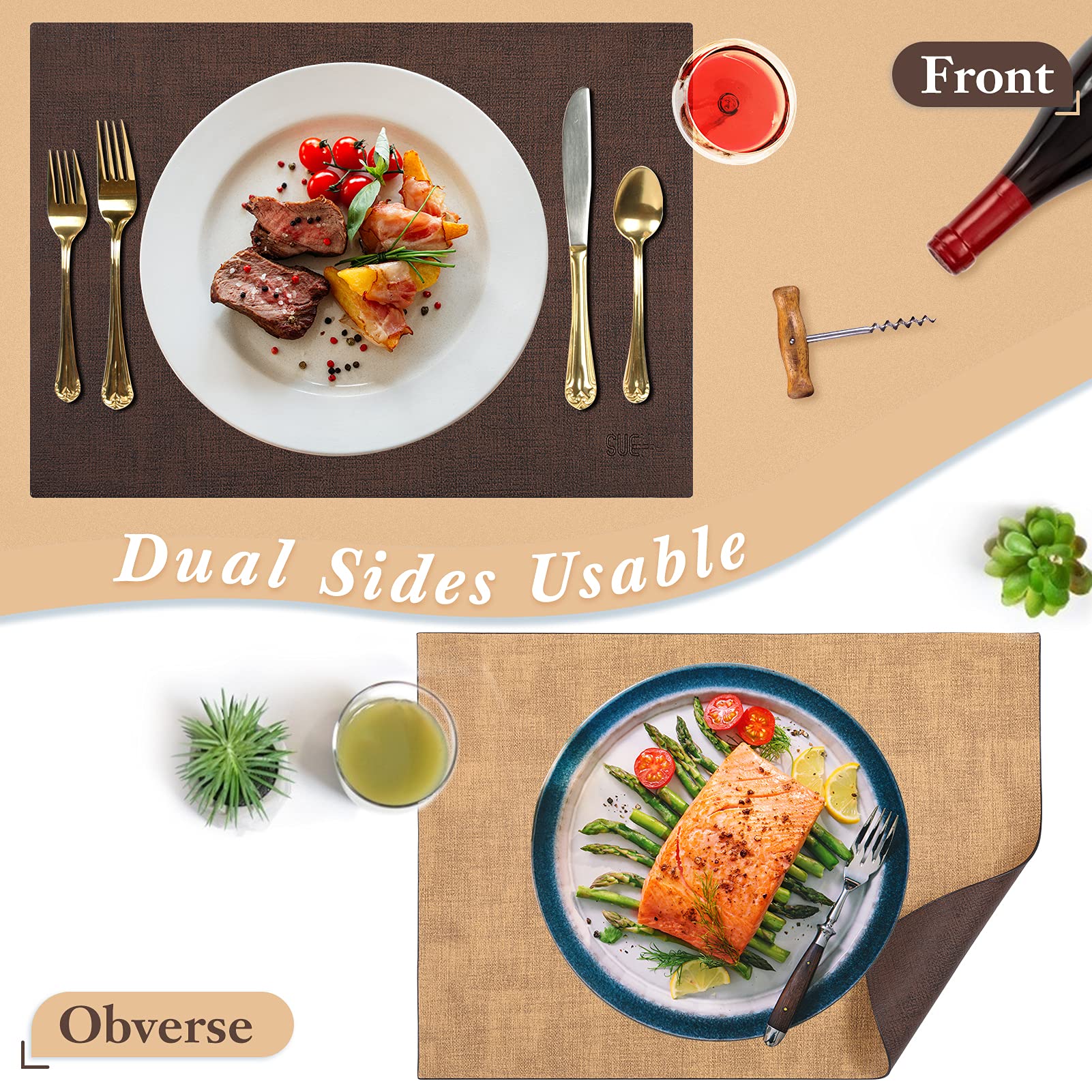 • SET THE MOOD FOR ANY OCCASION - SUEH DESIGN classic leather placemats are simple yet elegant. Featuring two-toned design, it's a great way to mix up your dinner table by showing different colors. These place mats are elegant enough for the indoor dining table yet durable enough for direct outdoor sunlight. No matter the season or occasion, they will compliment any table setting.
