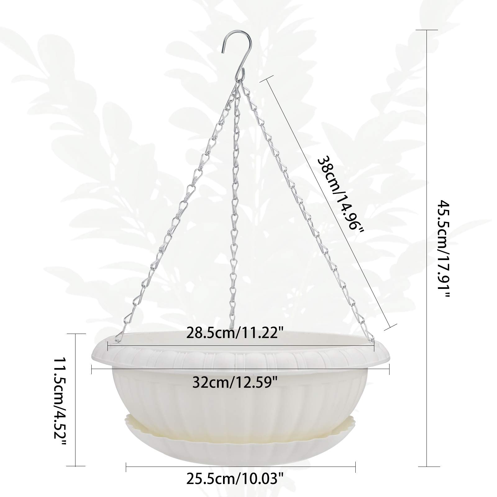 • Size: Hanging planters have an outer diameter of 32cm/12.59' and an inner diameter of 28.5cm/11.22'. The total height with tray and chain is 45.5cm/17.91'.