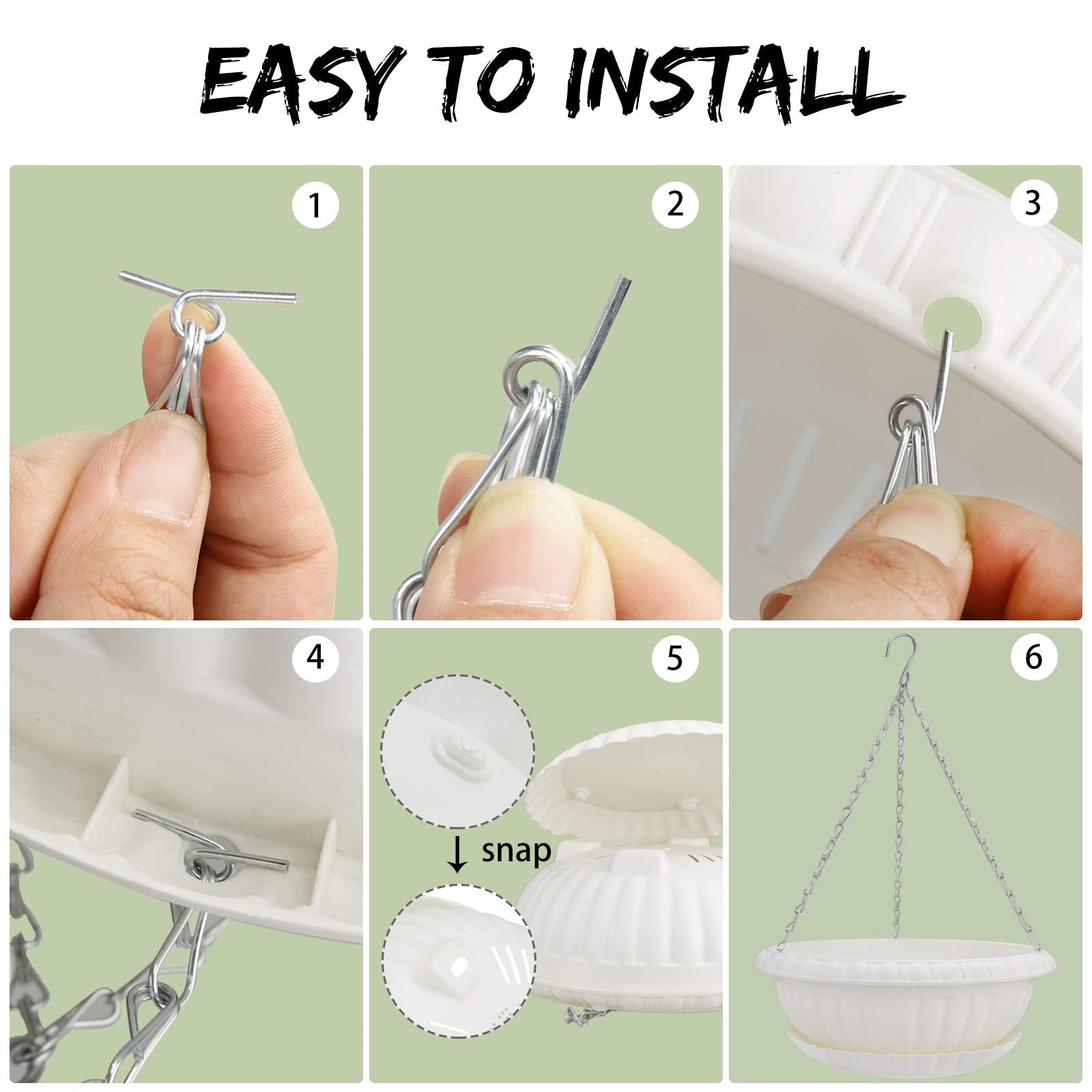 • Easy Installation: Metal chains are included and can be installed by passing through the drainage holes. Tray can be snapped into groove at the bottom of the pot.