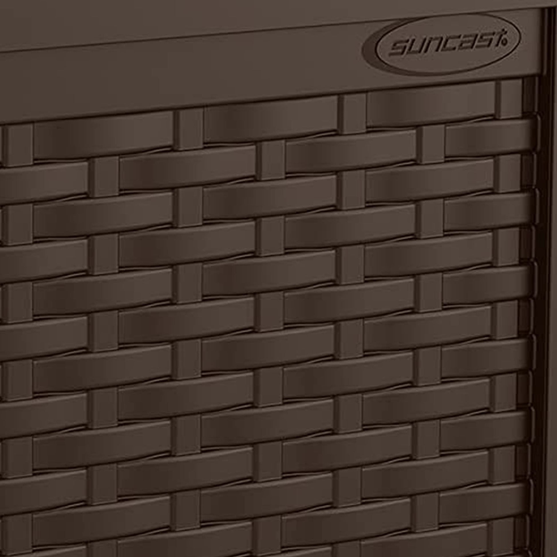 Details: The wicker plastic storage container from Suncast is an attractive and highly versatile solution for use throughout your home and yard. The chest design and hinged lid allow for easy access to your tools and accessories. With a holding capacity of 22 gallons (17' x 22' x 20.5'), the deck box is compact and space-efficient, easily tucked away in your laundry room or garage. Use it on your deck to stow away patio cushions, gardening tools and grill accessories, or in your house to store boots, gloves, hats, and more. The weatherproof body will resist fading, while the rain water flows off of the box without pooling to keep your belongings dry and mildew-free. Constructed with durable and waterproof resin that is built to last a lifetime.