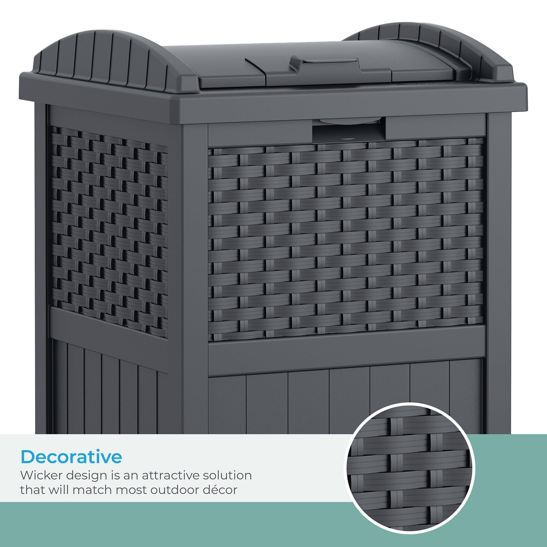 Suncast 33 Gallon Wicker-Style Hideaway Trash Can with Secure Latching Lid and Weather-Resistant Construction for Patio, Cyberspace Grey, Made in the USA