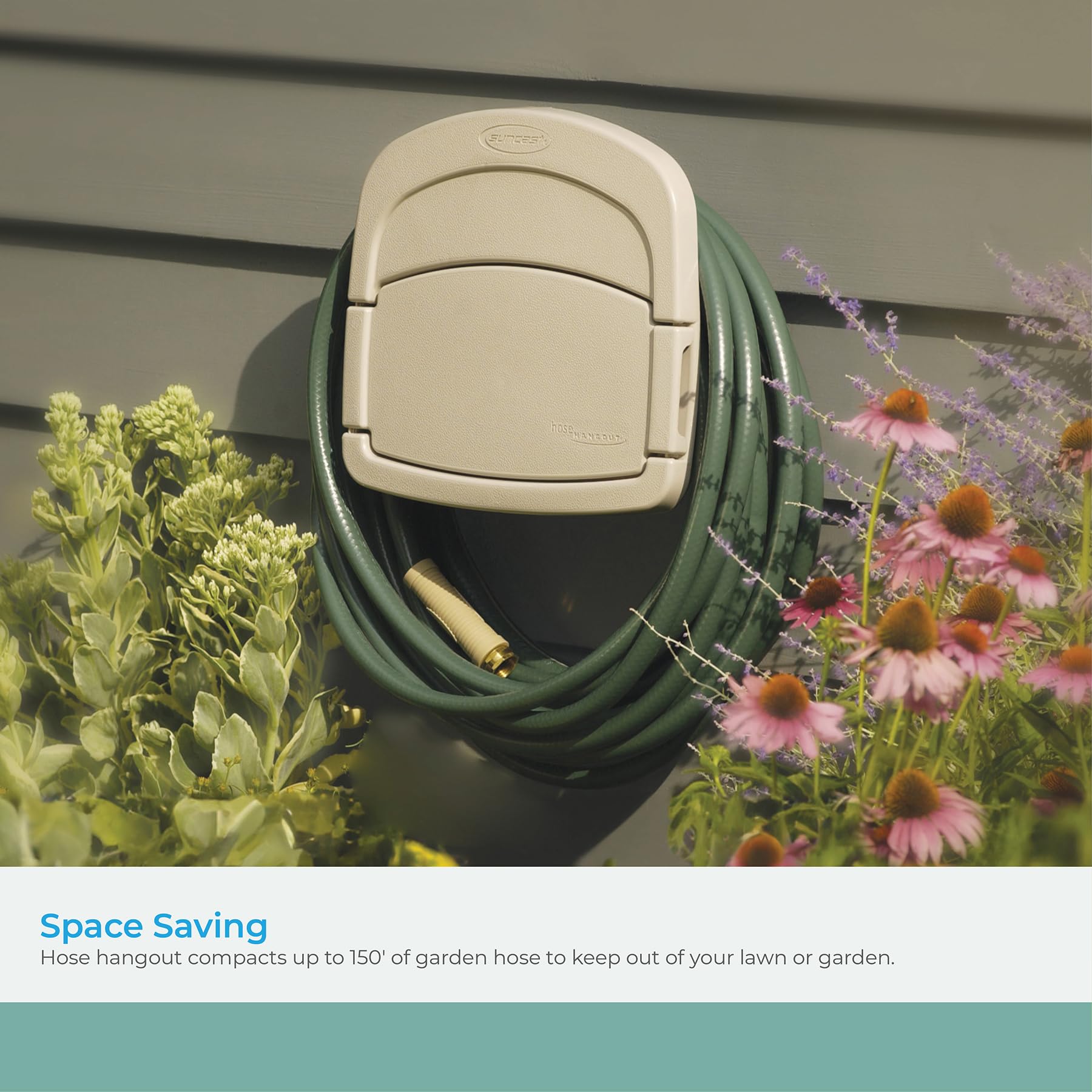 • SPACE SAVING: Hose hangout compacts up to 150' of garden hose to keep out of your lawn or garden