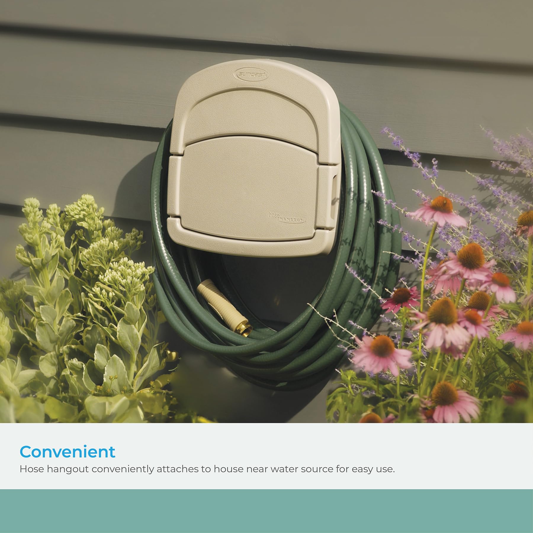 This Suncast Hose Hangout is a convenient, space-saving storage compartment for holding nozzles, garden gloves, and hose accessories. It is designed to hold up to 150 feet of garden hose wrapped around its sturdy plastic frame. The Hangout mounts via six points in the back and comes with explicit mounting instructions. While it does come fully assembled, actually mounting it to the side of your home will require the use of a drill, and mounting screws are not included. Its textured beige finish blends well with most exterior paint colors.