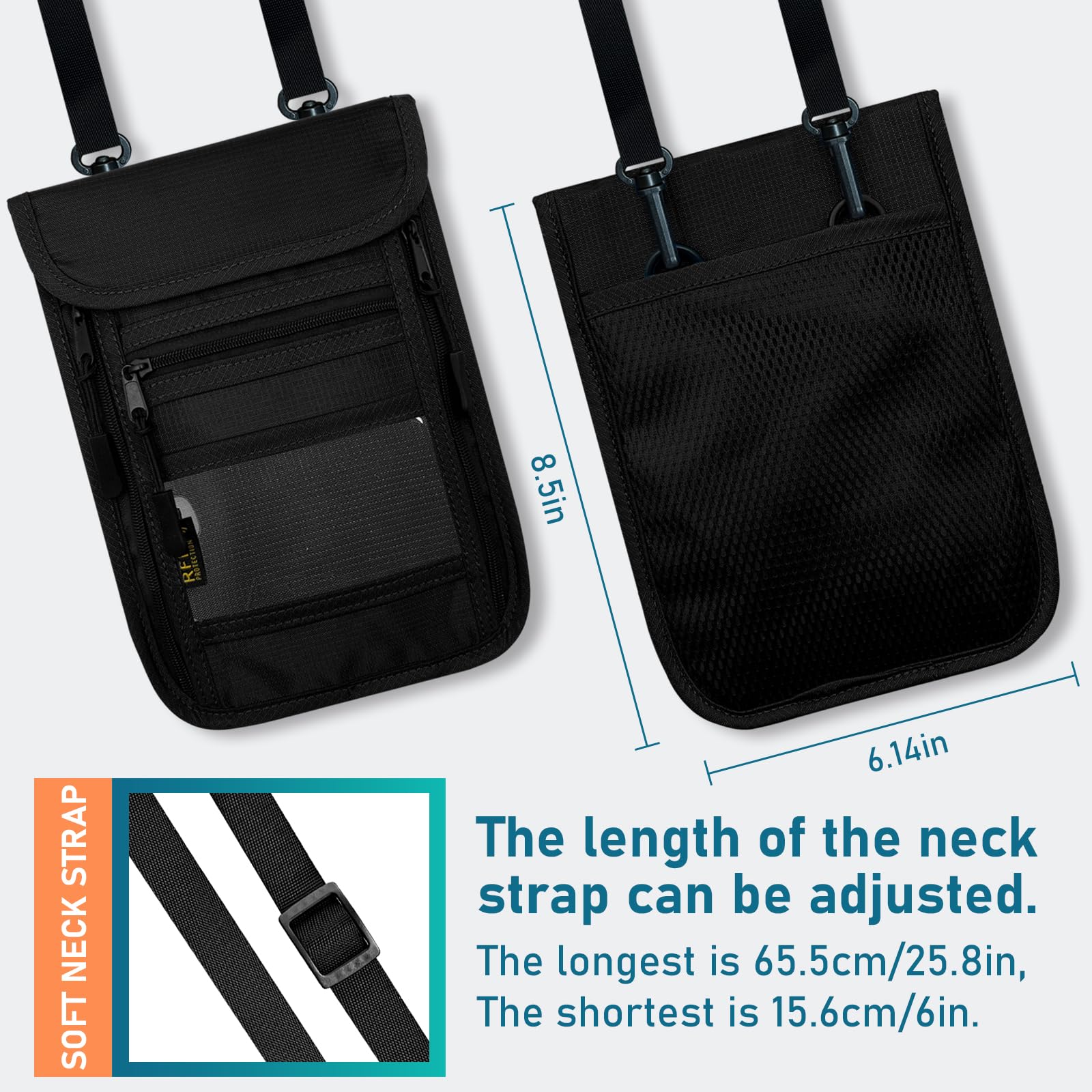 • Slim and lightweight - This secure passport clip is 5.6 inches wide and 8 inches high, slim enough. This travel wallet includes a soft and adjustable neckband that adjusts from 15 inches to 55 inches according to your needs. Hanging around the neck or hidden under clothes does not add unnecessary volume, providing comfort and convenience.