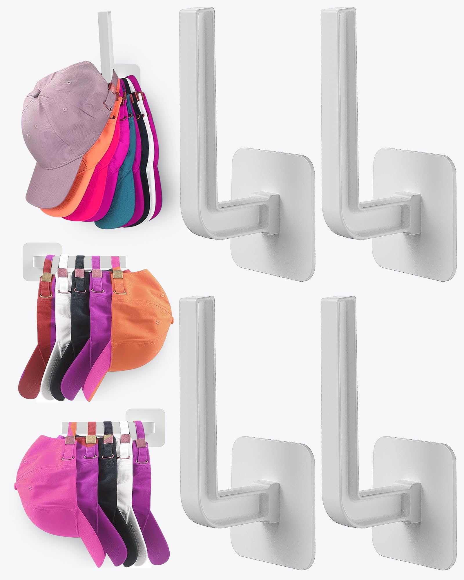 Sunfanie Hat Rack for Hat Storage (4-Pack), Multi-Purpose Hat Organizer, Strong Adhesive Hooks for Wall Organizer for Baseball Caps, Two Mounting Options Hook, White
