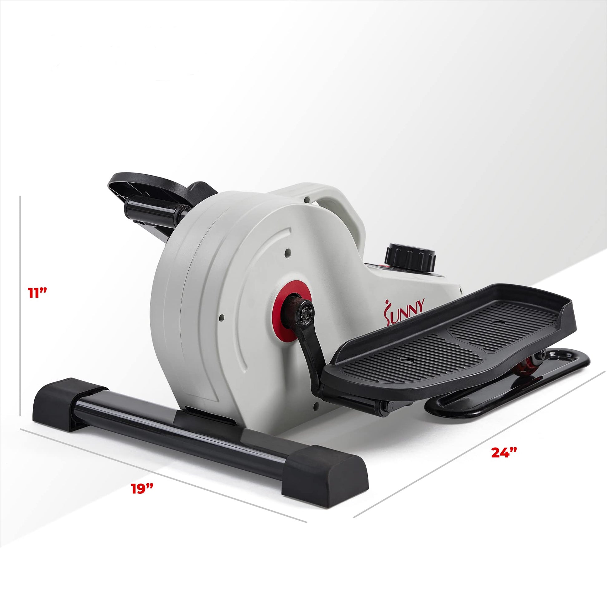 Details: Boost your fitness routine with our under-desk pedal exerciser from Sunny Health & Fitness. This compact, low-impact device, reviewed positively by over 10,000 customers, is perfect for burning calories, improving cardiovascular health, and toning muscles without straining your joints. Enjoy its smooth, silent operation, thanks to a belt drive mechanism with magnetic resistance. The elliptical fits comfortably under most desks, offering an easy way to incorporate fitness into your daily routine. Track your progress through a comprehensive digital monitor displaying time, speed, calories, and distance. With 8 levels of adjustable magnetic resistance, you can customize your workout to suit your fitness level. Our elliptical comes fully assembled for a hassle-free start and its lightweight design with an integrated handgrip ensures easy storage and transport. Trust in the reliable quality of our products, backed by over 20 years of industry experience.