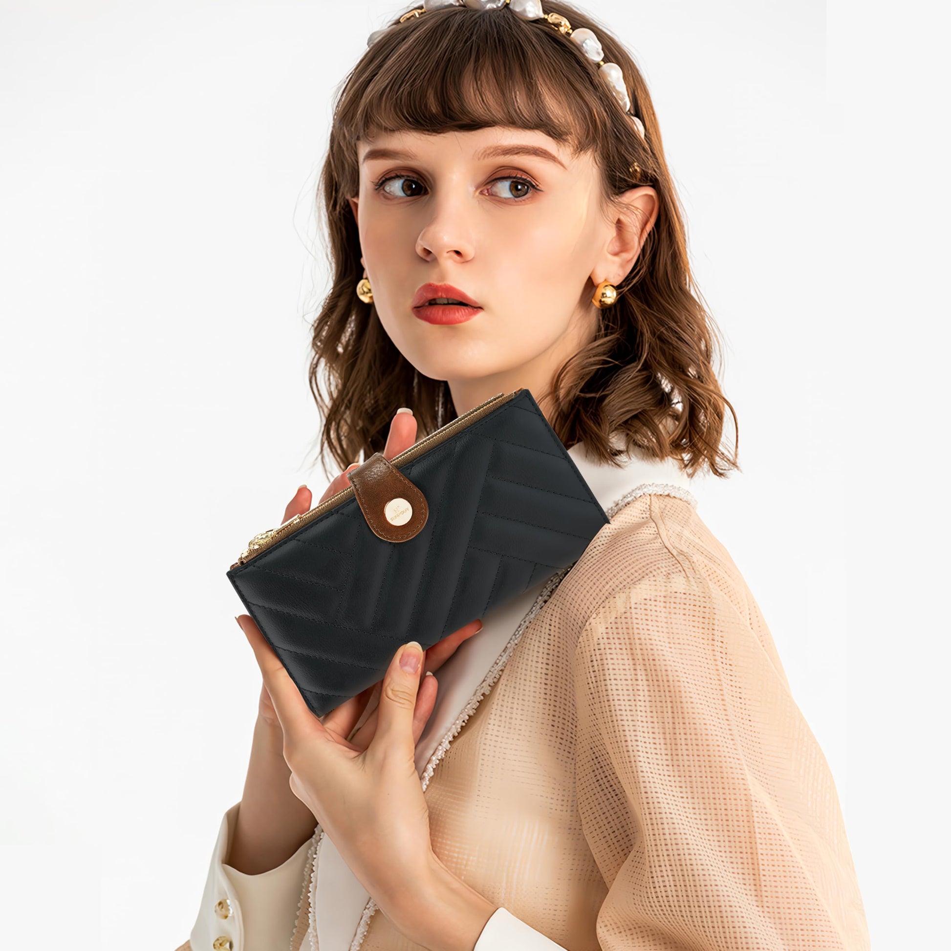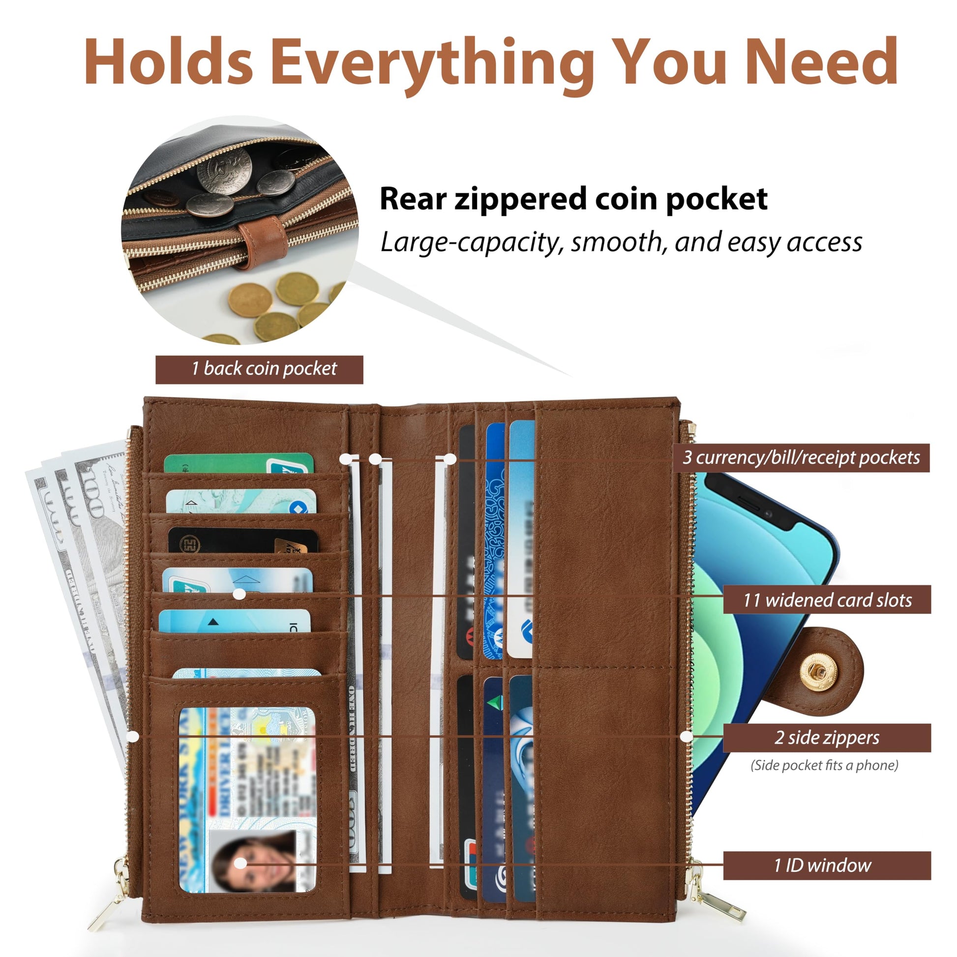 • Ample Capacity & Functionality:This thin womens wallet slim features 11 widened card slots, 1 ID window, 3 currency/bill/receipt pockets, 2 side zippers, and 1 back coin pocket. The clear ID window with thumb hole and widened slots make card access easy. Despite its slim profile, this women's leather wallets design offers ample space for cards, ID, cash, coins, receipts, and even your phone.