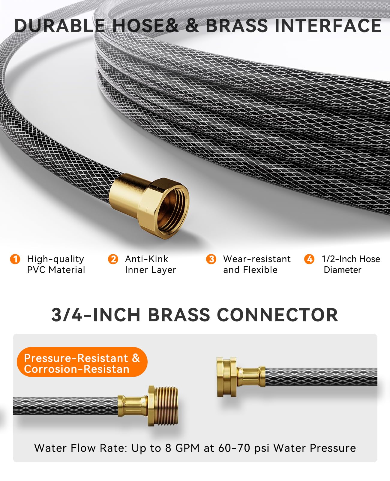 • Heavy Duty 1/2-Inch Hose with Brass Fittings:Features a 1/2-inch diameter hose and 3/4-inch solid brass fittings, ensuring leak-proof connections and long-lasting performance.