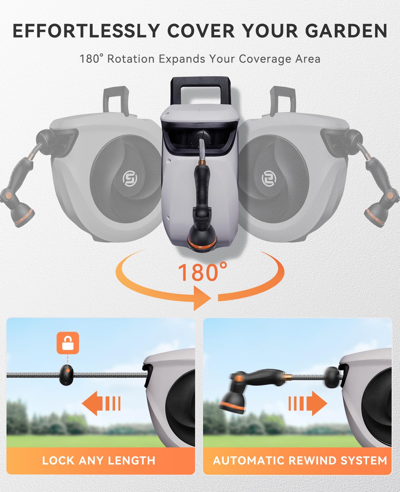 • 180°Swivel Bracket for Flexible Coverage:The wall-mounted swivel bracket rotates 180,offering maximum flexibility to water all areas of your garden or workspace. Enjoy full coverage without repositioning the reel.