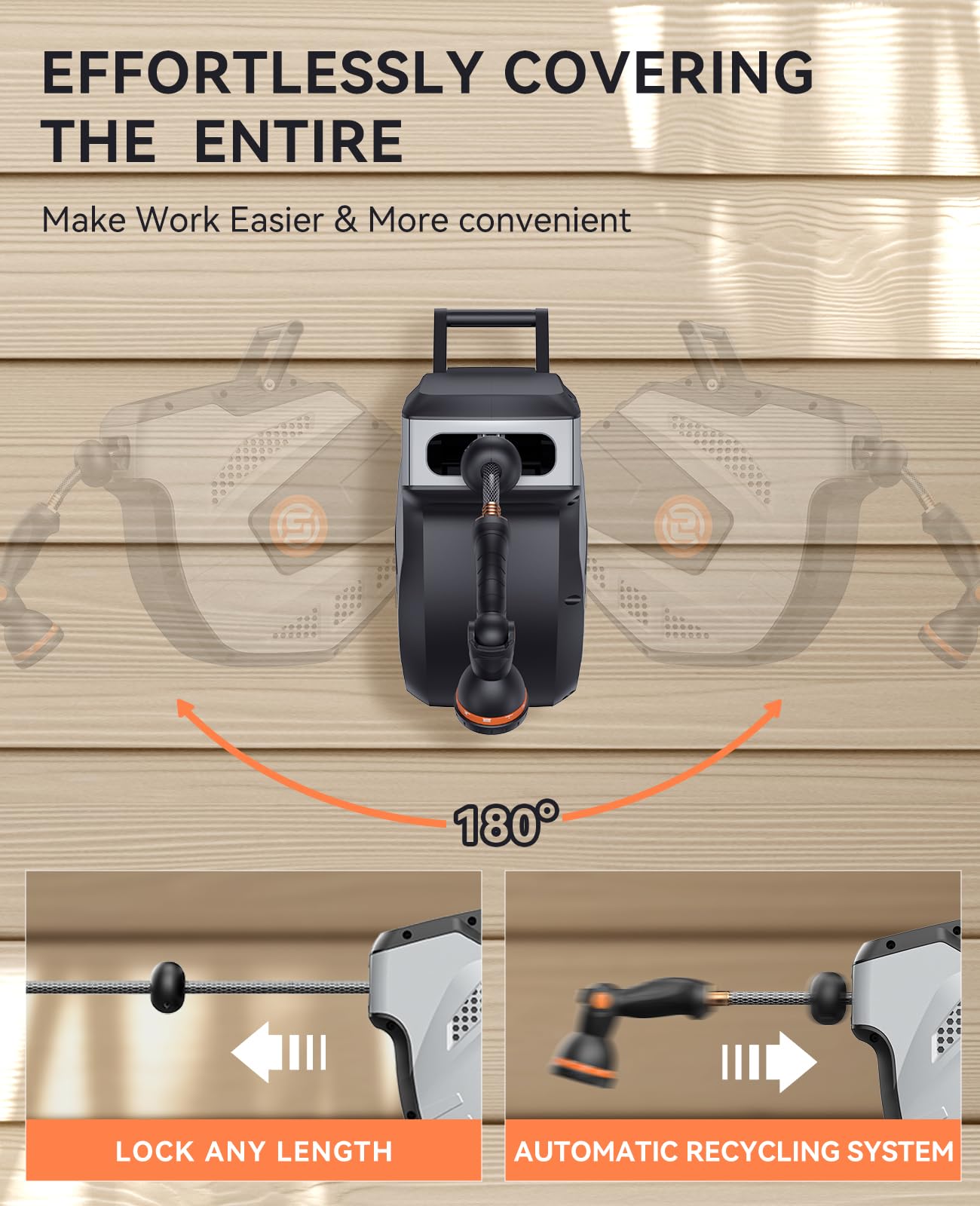 • ๐‹๐จ๐œ๐ค ๐€๐ง๐ฒ ๐‹๐ž๐ง๐ ๐ญ๐ก: Easily control the length of the hose! Our garden hose reel features a smart locking system that allows you to easily lock any desired length