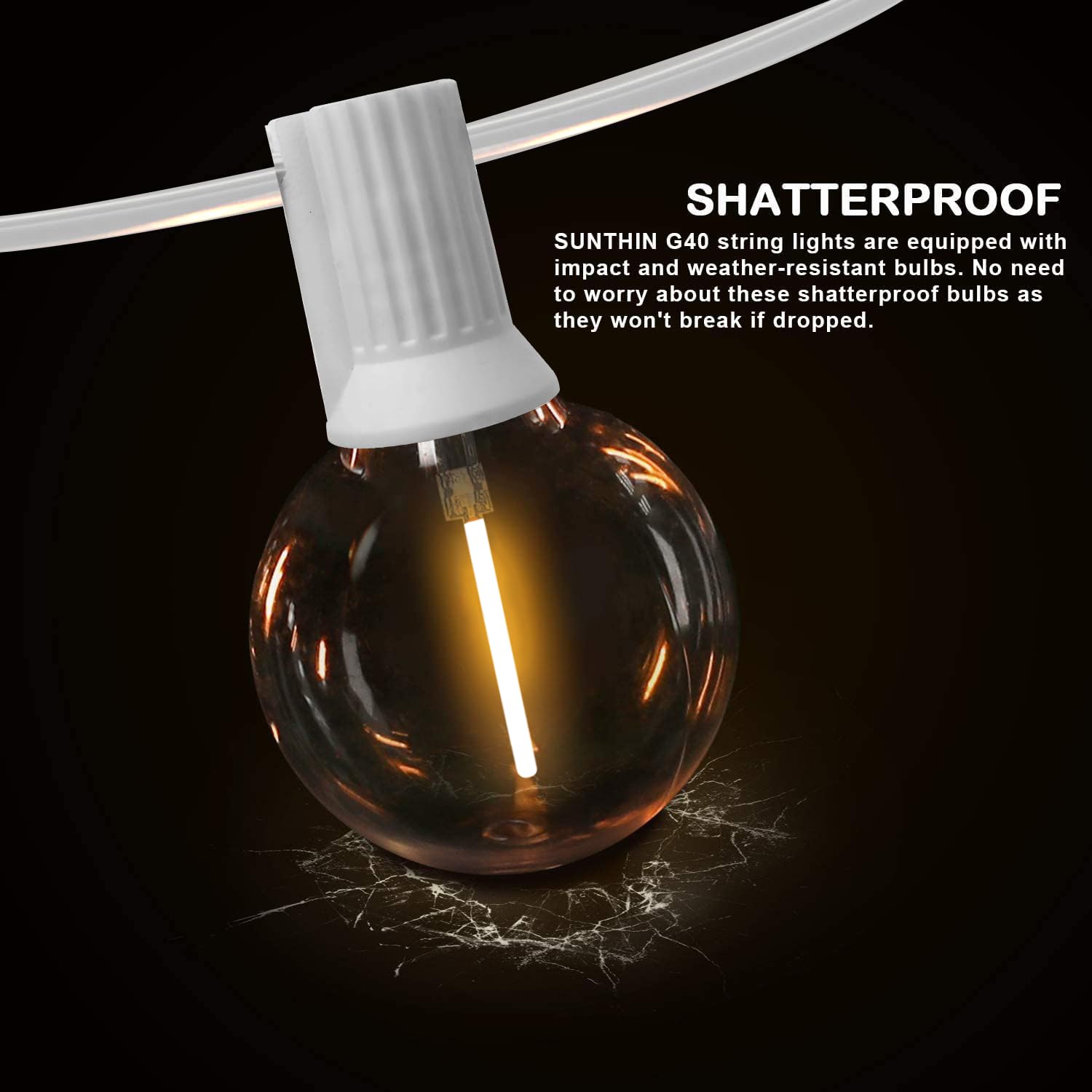 • 【Shatterproof & Waterproof】The G40 bulbs are made of plastic and much safer and durable than traditional glass bulb, which won't break if dropped. Outdoor string lights white cord withstand all weather for year-round enjoyment