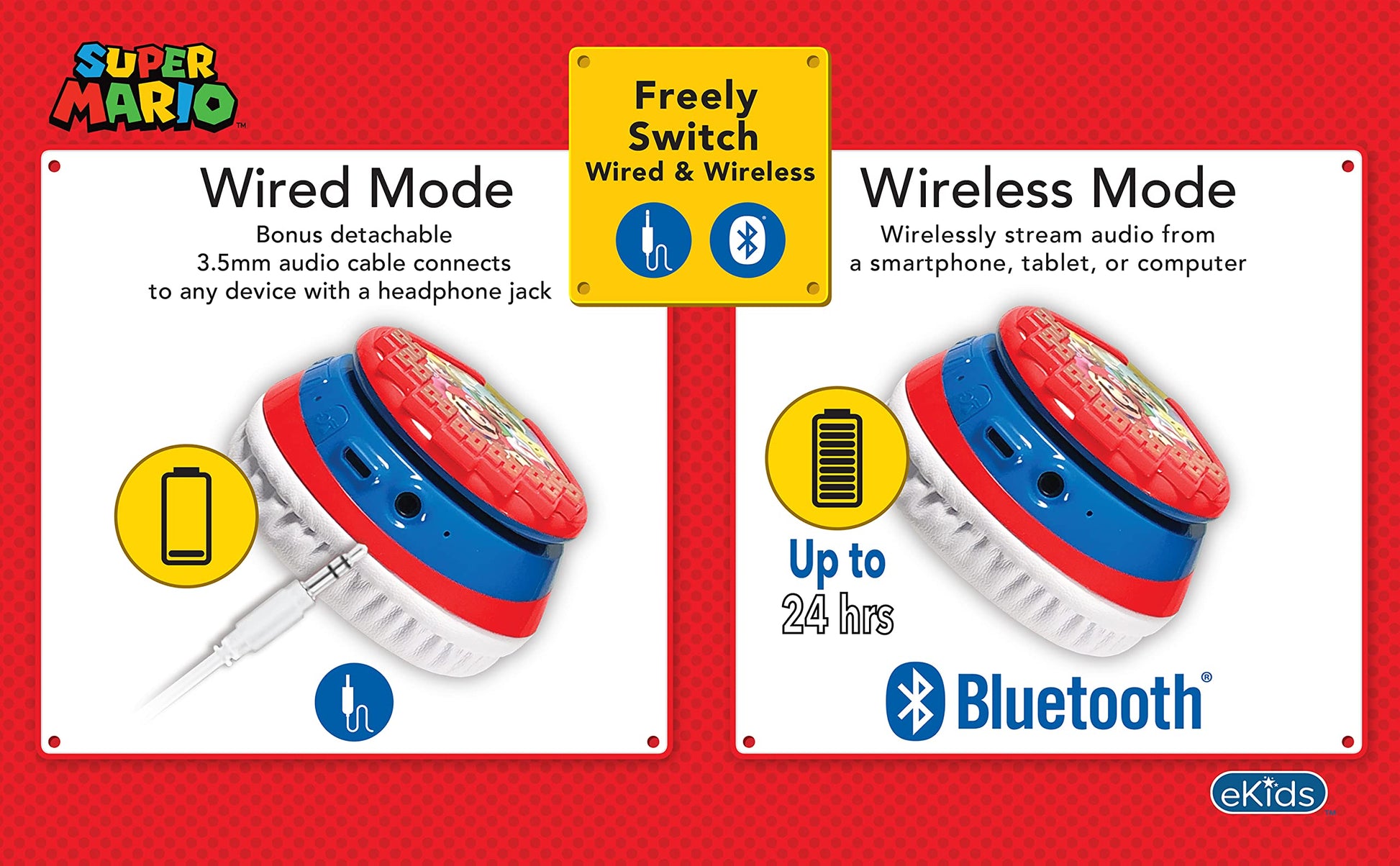• Perfect Gift: Kids wireless headphones feature cool graphics inspired by the popular video game. Looks great on any fan of Super Mario Bros, and makes the perfect gift for any occasion. Visit the ekids brand store to explore even more cool products!