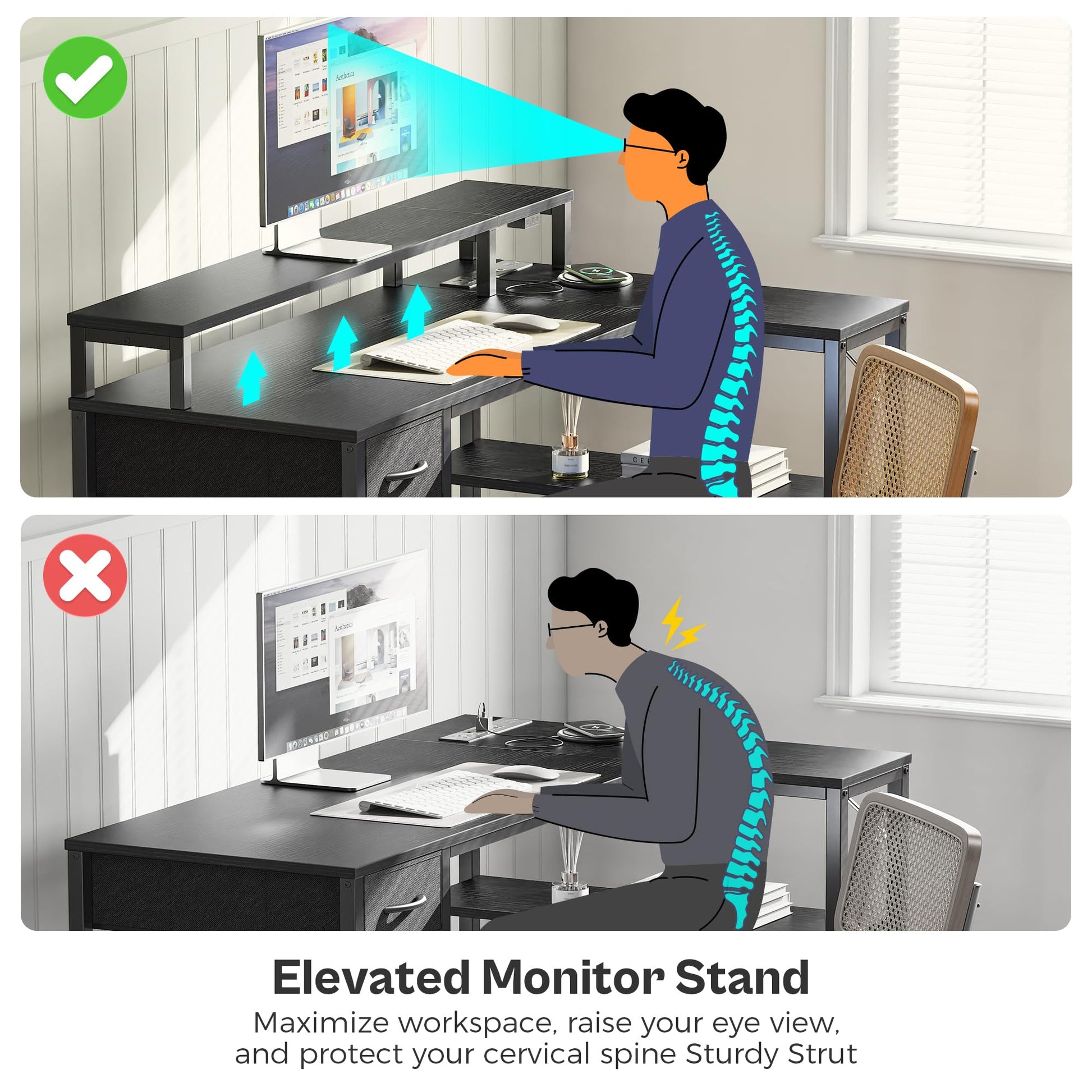 • 【Desk with Power Outlets】4 AC outlets and 2 USB ports on the gaming computer desk allow you to charge your monitor, office or gaming devices with ease. And the monitor stands help to elevate your eye lines, avoiding neck and back pains. Super considerate writing desk.