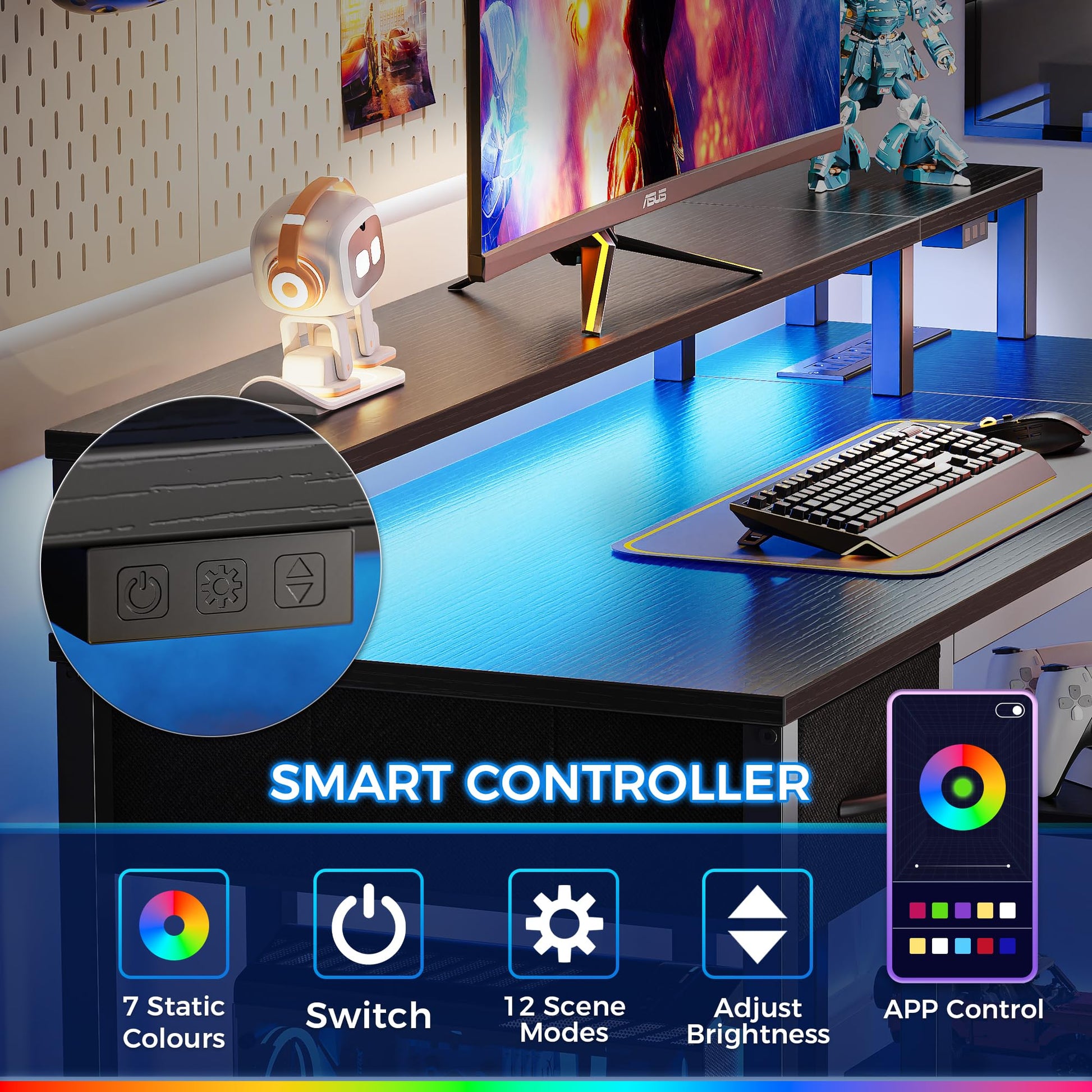 • 【Desk with LED Lights】Create the perfect ambiance for gaming or working with this computer desk. Choose from over 60,000 colors and enjoy the timing mode, mic mode, and music mode via the App. Alternatively, use the smart controller to switch between 12 scene modes, adjust speed levels, and set 3 brightness levels. Plus: The LED light strip needs to be plugged into a USB port to work