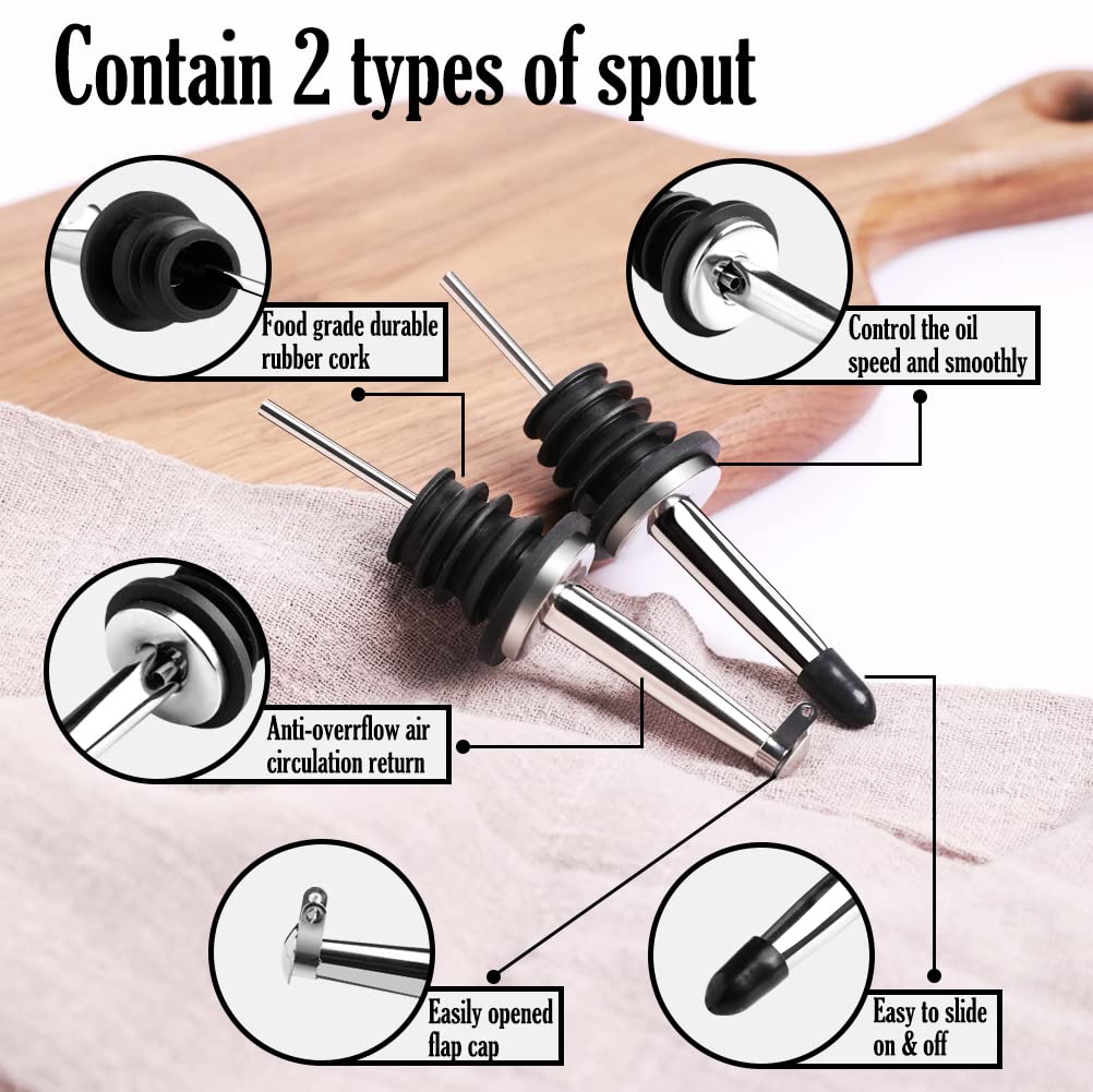 • Two Controlled Pouring Spouts - 18/8 Stainless steel pour spouts with sealed cap or flap cap, fit the bottle well and keep dust out. The pouring fluid is smooth without sticking and can easily dispense the right amount of oil for a healthy diet.