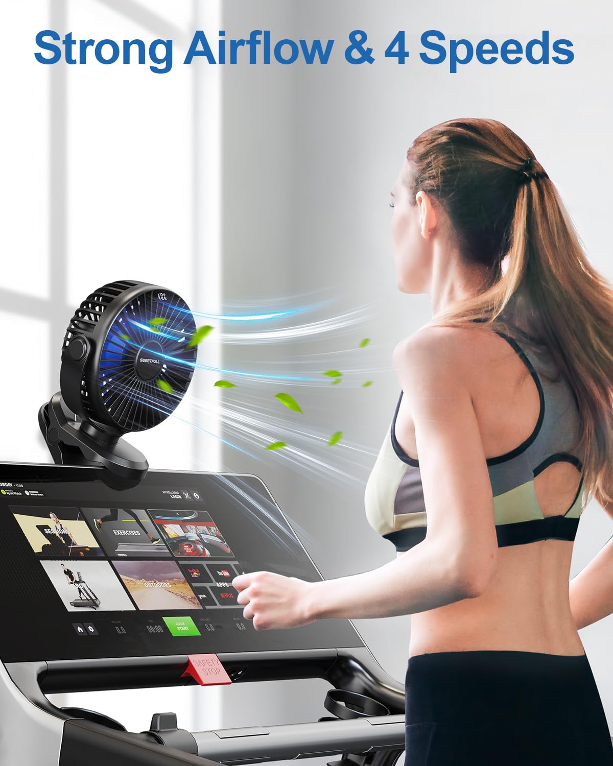 SWEETFULL Portable Clip on Fan - Battery Operated Stroller Fan, 4000mAh Small Rechargeable Fans with LED Display, 4 Speeds, Mini Personal Cooling Desk Cooler for Golf Cart Travel Camping Gym (Black)