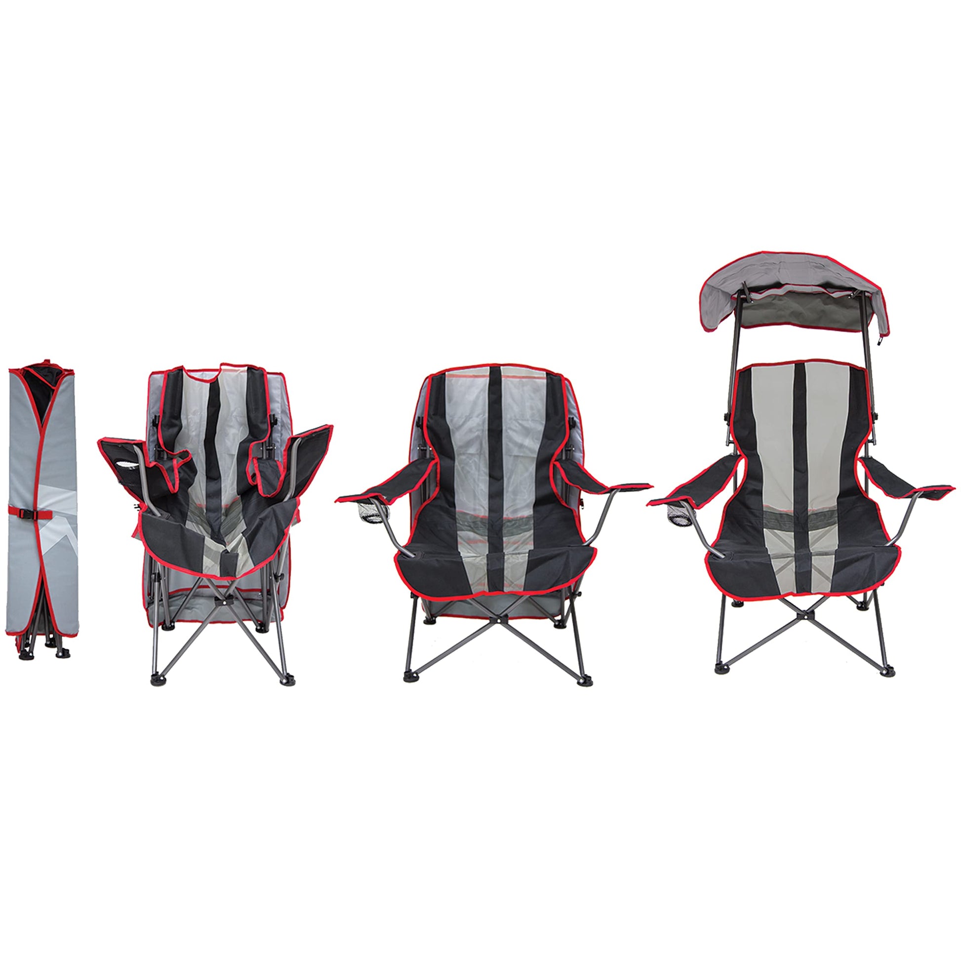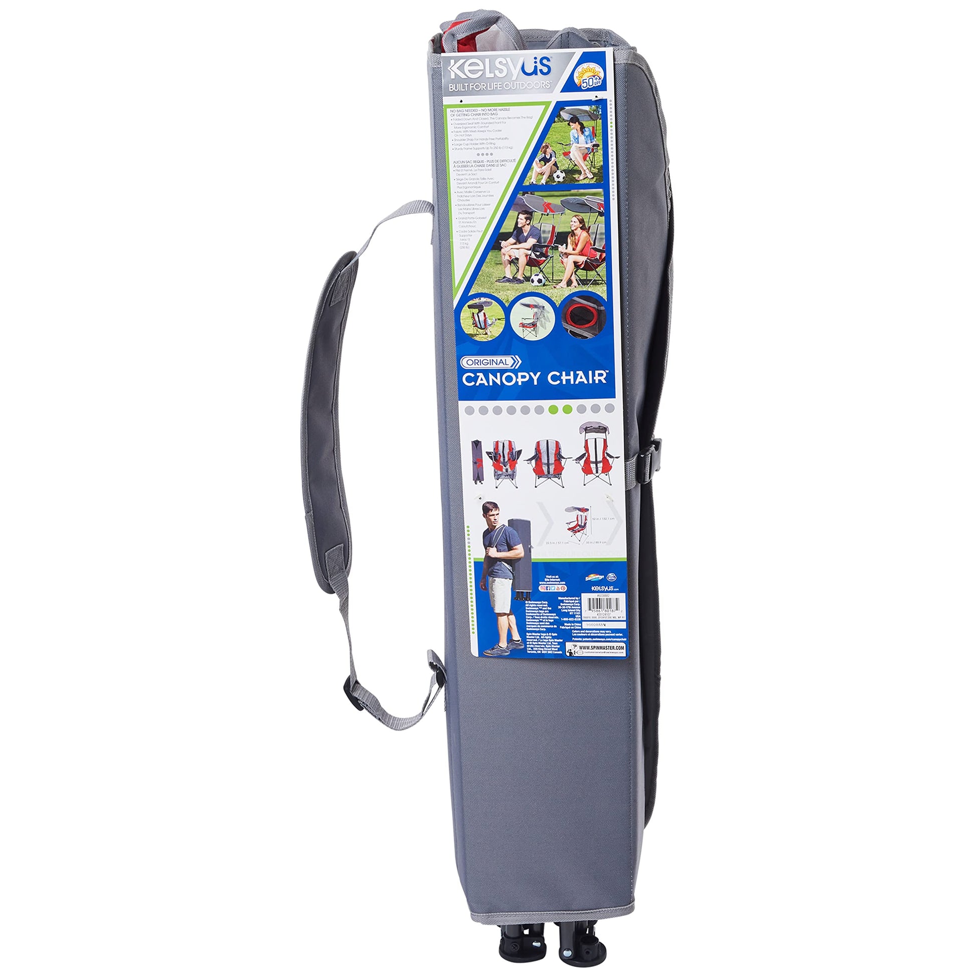 Details: Protect yourself from the elements with the Kelsyus Original Foldable Canopy Chair. This portable camping chair converts from a familiar quad-style camp chair into your own personal canopy-covered outdoor oasis. The retractable sun canopy protects you from the elements with 50+ UPF sun protection, and it can be lowered behind the chair while you are still seated when you want to catch some rays. The large cup holder with o-ring provides stability and convenient access to your favorite drink, while the oversized arm rests offer added comfort. The canopy becomes the carry case when folded secured by a durable snap-lock buckle, and the attached shoulder strap provides hands-free portability - no carrying bag needed! Additional premium features make it the leader of the pack, such as an oversized seat with a rounded front edge for more ergonomic comfort and breathable mesh fabric to keep you cool. The sturdy powder-coated steel frame provides long-lasting durability and can support kids and adults up to 250 lbs. The Kelsyus Original Canopy Chair is the perfect companion for your family camping trips, tailgating, and for watching the kids from the sidelines! One grey and red chair is included measuring 37'L x 24'W x 58'H.