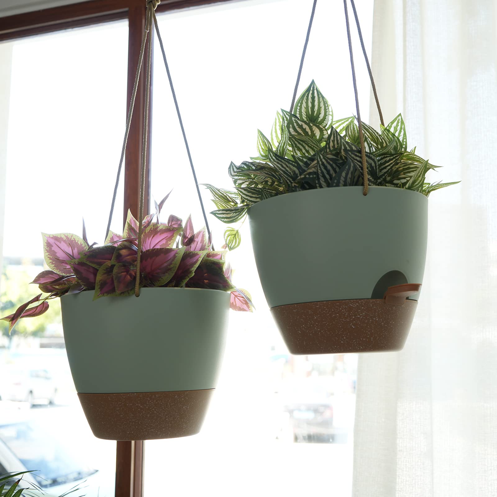 SwinDuck 10 Inch Self Watering Hanging Pots, 2 Pack Hanging Planters with 40oZ Deep Reservior for Indoor Outdoor Plants Flowers, Green with Brown