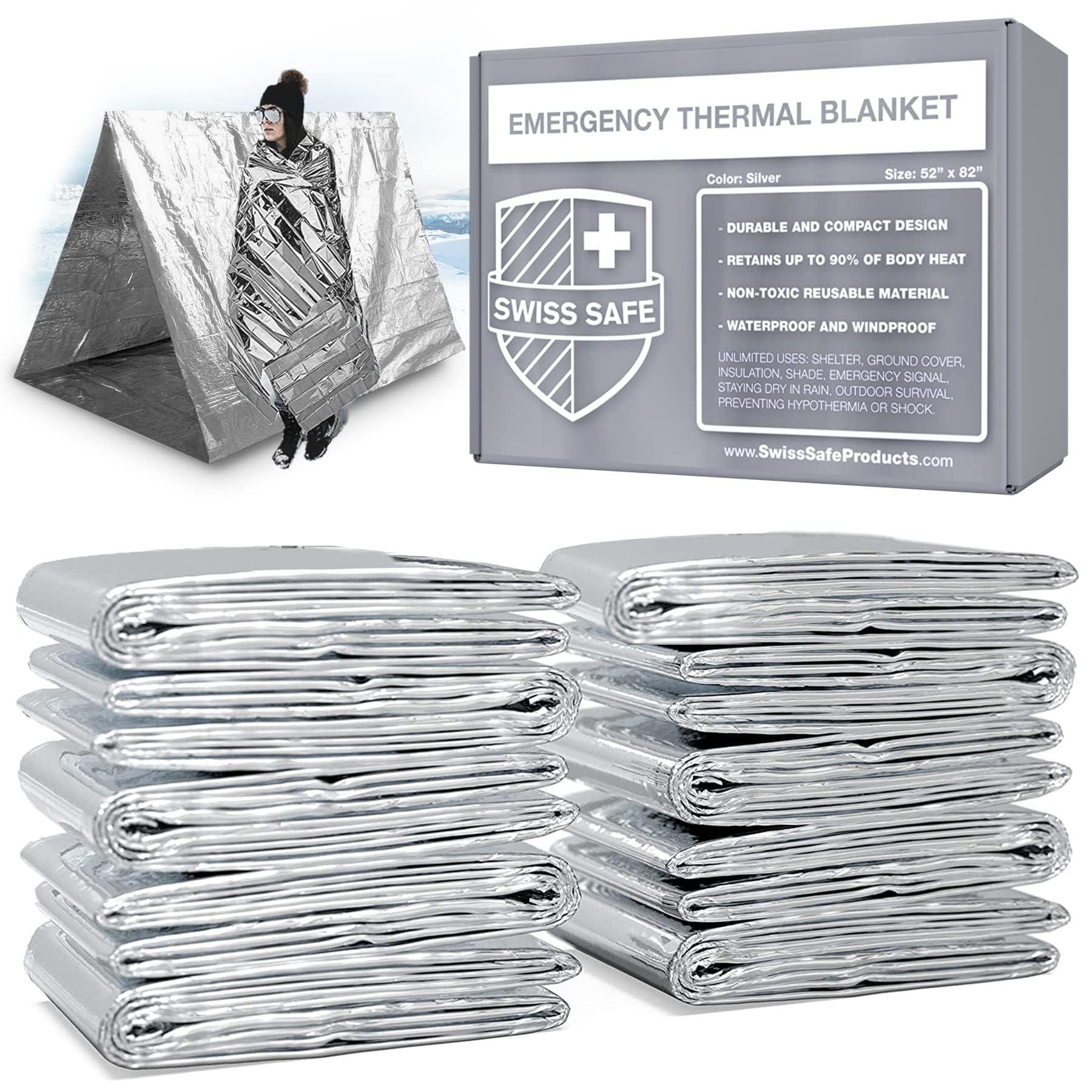 Swiss Safe 10 Pack Mylar Emergency Blankets for Survival - Compact & Insulated for Cold Weather - Designed for NASA, Outdoor, Running, Camping, Survival, First Aid Car Kit - Silver, 10 Pack