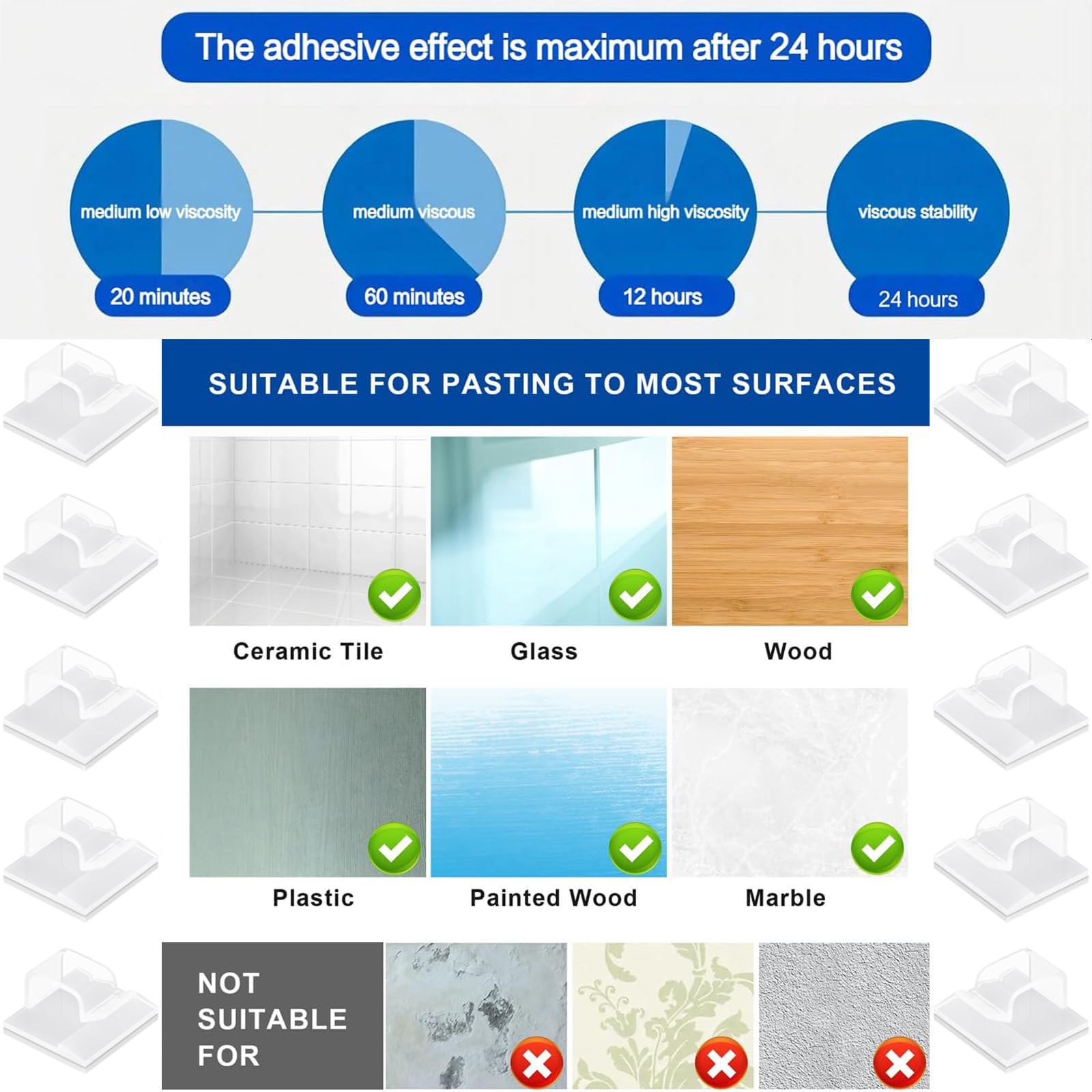 • Precautions :adhesive cord holder Suitable for smooth surfaces such as wood, glass, marble, metal, wallpaper, etc,use self adhesive cable clips Before Please clean the installation surface, stick and press firmly on the 4 corners for 10 seconds. After 24 hours of use, 3M adhesive has the best adhesion