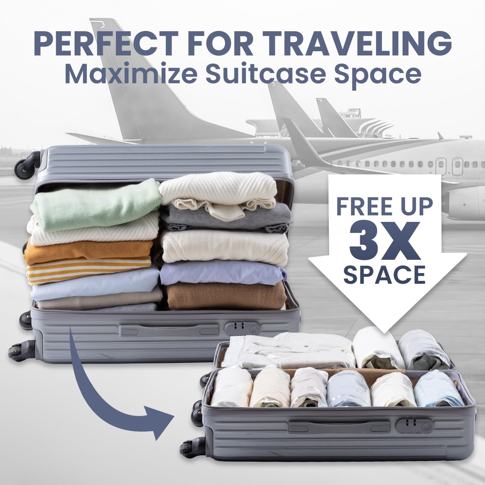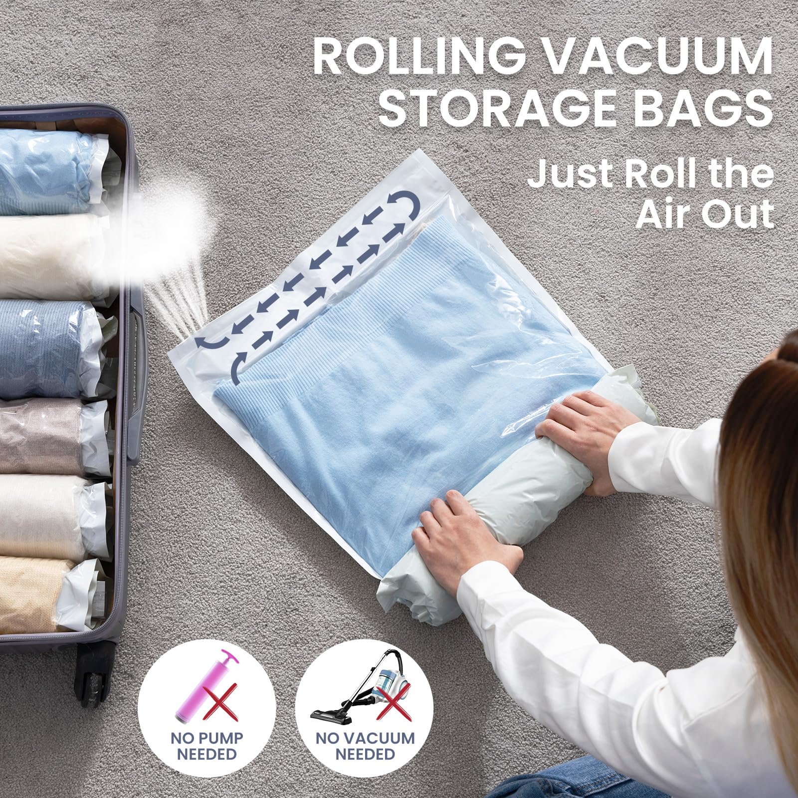 • Designed for Travelers & Backpacker - No Vacuum Cleaner or Pump Needed! Just zip, fold the bags to remove most of air, and roll-up the bag, the rest air will be push out from the air channel at the bottom of the bag. Super easy to pack your luggage