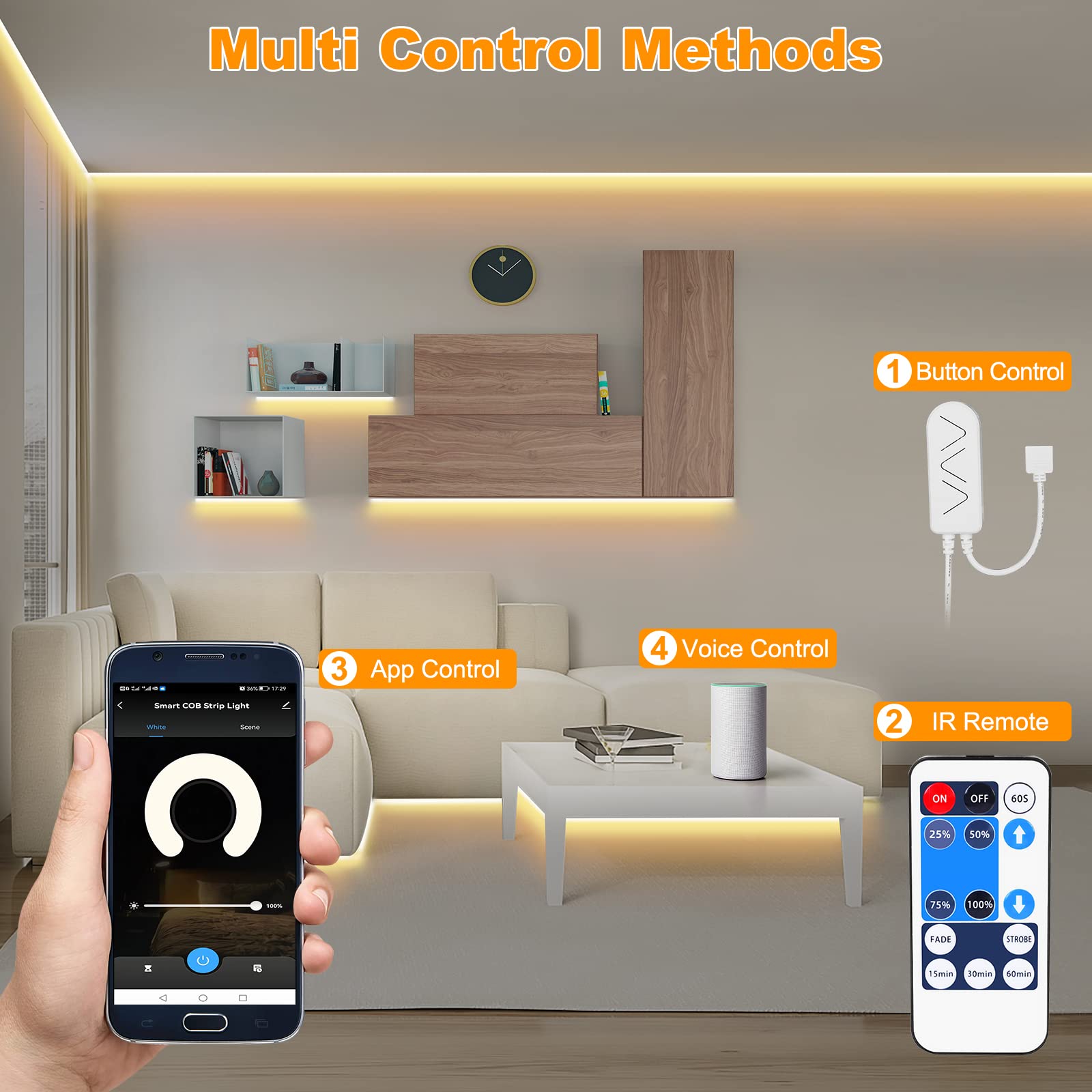 • Multi control ways: The cob led strip could be control by controller button, IR remote, voice comands, Tuya or smart life app.