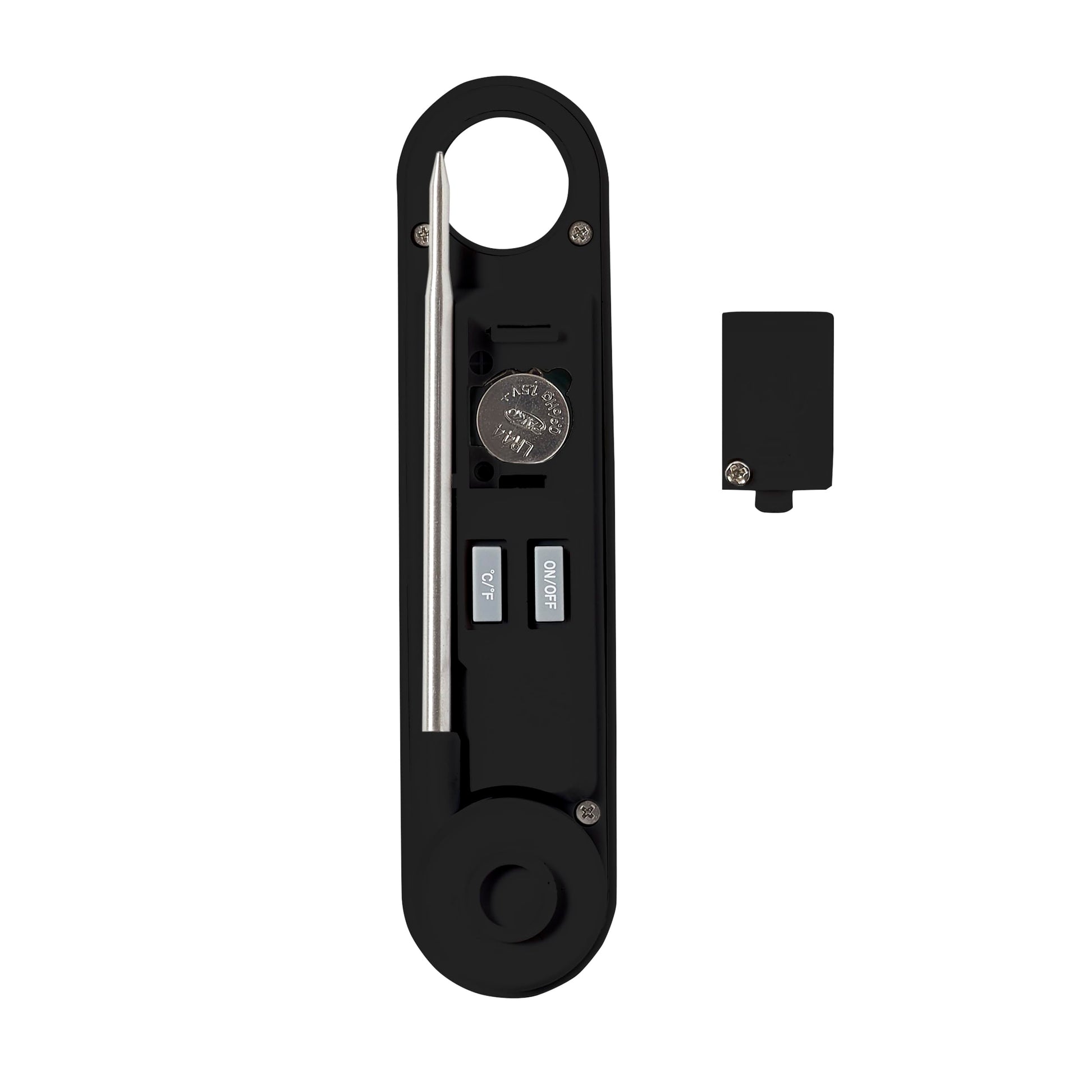 Details: This thermometer is compact in size, folds away for convenient storage, and has a built in carrying hole. The small size is perfect to take along for grilling, tailgating, or vacations. The thermometer has a wide temperature range of -40 F to 450 F (-40 C to 230 C) that can be read on the large 0.7” LCD readout. The thermometer comes with an ON/OFF button on the back of the unit along side the C/F switch.